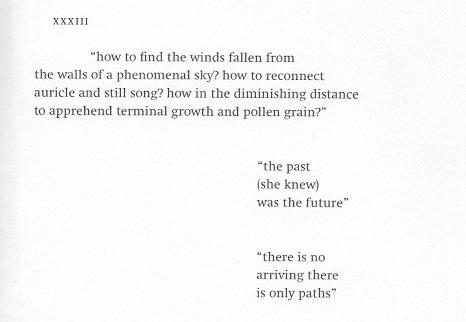 “¿Cómo encontrar los vientos caídos de los muros de un cielo fenomenal? ¿Cómo reconectar el pabellón auricular y el canto del zancudo? ¿Cómo aprehender en la distancia menguante el crecimiento terminal y el “El pasado (ella lo sabía) era el futuro”