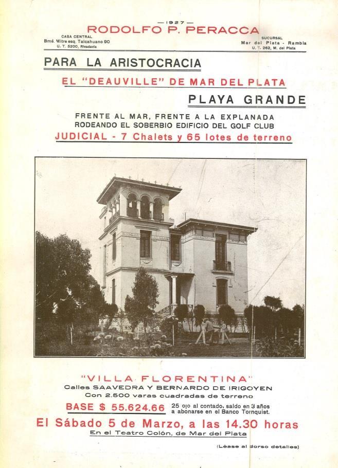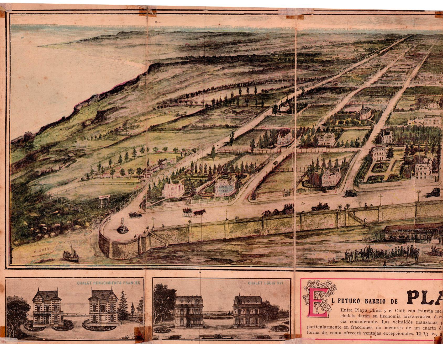 “El 7 de abril de 1909 Cecilia Peralta Ramos de Lestache vende a una sociedad integrada por Pedro Olegario Luro, Ernesto Vergara Biedma y la firma Lassalle y Echeverría, tres chacras con unos 78.000 m2 de superficie. Más tarde, la sociedad llamada Sindicato de Playa Grande adquiriría otras tres chacras hasta totalizar una superficie de veintidós manzanas rodeadas por la Explanada y las calles Carlos Pellegrini, Peña y Almafuerte. Cada manzana se divide en cuatro partes y en quince de esos lotes se proyectan chalets con miras a promover la venta del conjunto