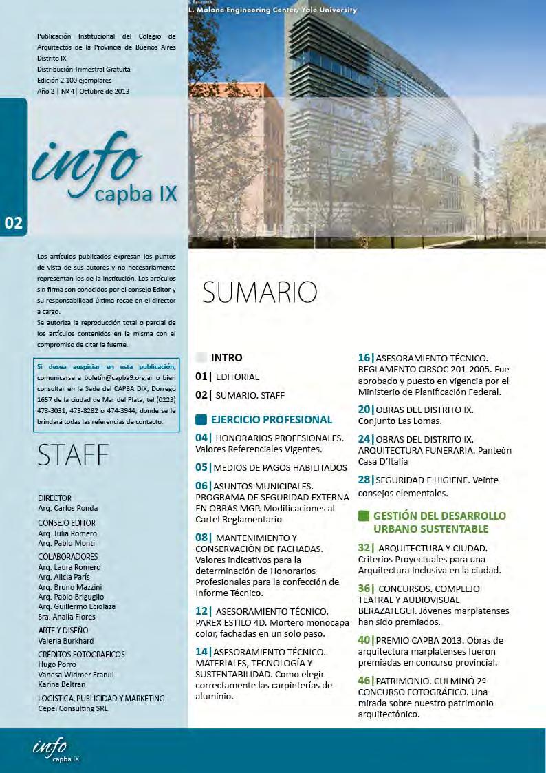 En esta edición del Info CAPBA IX continuamos afianzando esta herramienta de comunicación y tenemos la oportunidad de compartir más obras de profesionales del Distrito IX, junto con información necesaria para el ejercicio profesional, asesoramiento técnico, concursos realizados, nuevos servicios y beneficios, homenajes, delegaciones, entre muchos temas más.