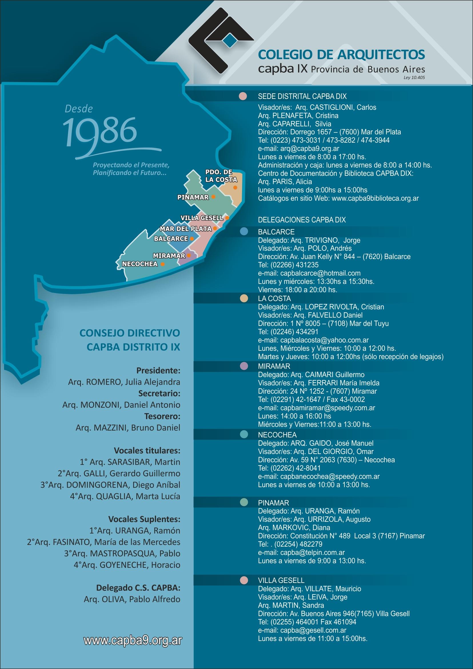Nuestro CAPBA ha cumplido 28 años desde su creación con la sanción de la Ley Nº 10405 en el año 1986, y en el CAPBA IX honramos este acontecimiento con la realización de un proceso de renovación de los Delegados Distritales. Mediante la organización y par cipación el Distrito IX ha logrado consolidar un modelo de ges ón que fortalece a la Ins tución y que contrasta con los sistemas de designación polí ca que se ejercen en el resto de la Provincia.