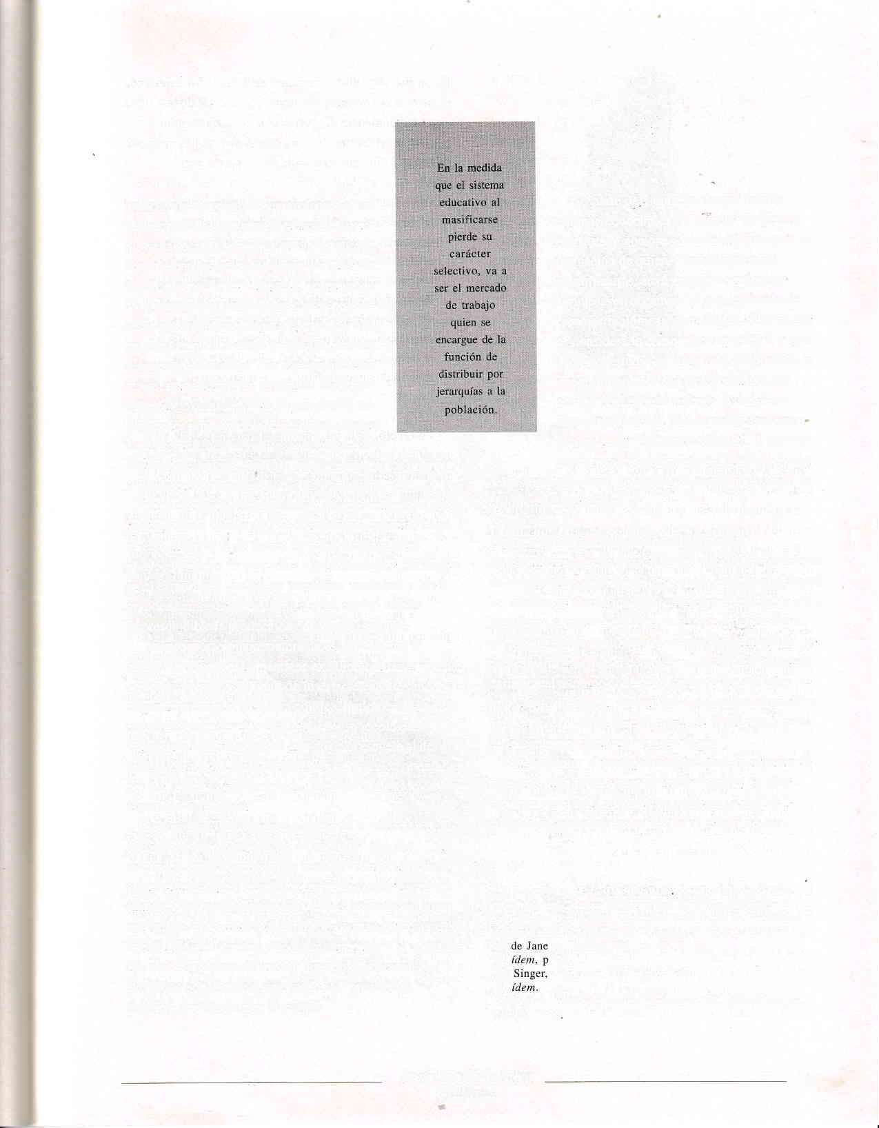 que lo educoción es un insirumento poro lo equidod y que contribuye, sin moyor especificidod, ol incremento de lo productividod. Es éste un recurso ideológico que se utilizo, cuondo en lo reolidod se ho demostrodo empíricomente que los beneficios direcios de lo educoción sobre lo productir,,idod no son homogéneos y refleion moyores beneficios poro quienes mós tienen... En consecuencio, los oportunidodes educotivos distribuidcs diferencio Imente prcfundizon los desiguoldodes sociocullurcrles y educotivos existentes y generon nuevos desiguoldodes... Limiior los obielivos de lo educoción o meioror lo productividod es reducir los potenciclidodes del proceso educoiivo poro lo {ormoción de los hombres y colocor o éstos en lc condic¡ón de móquinos.rr