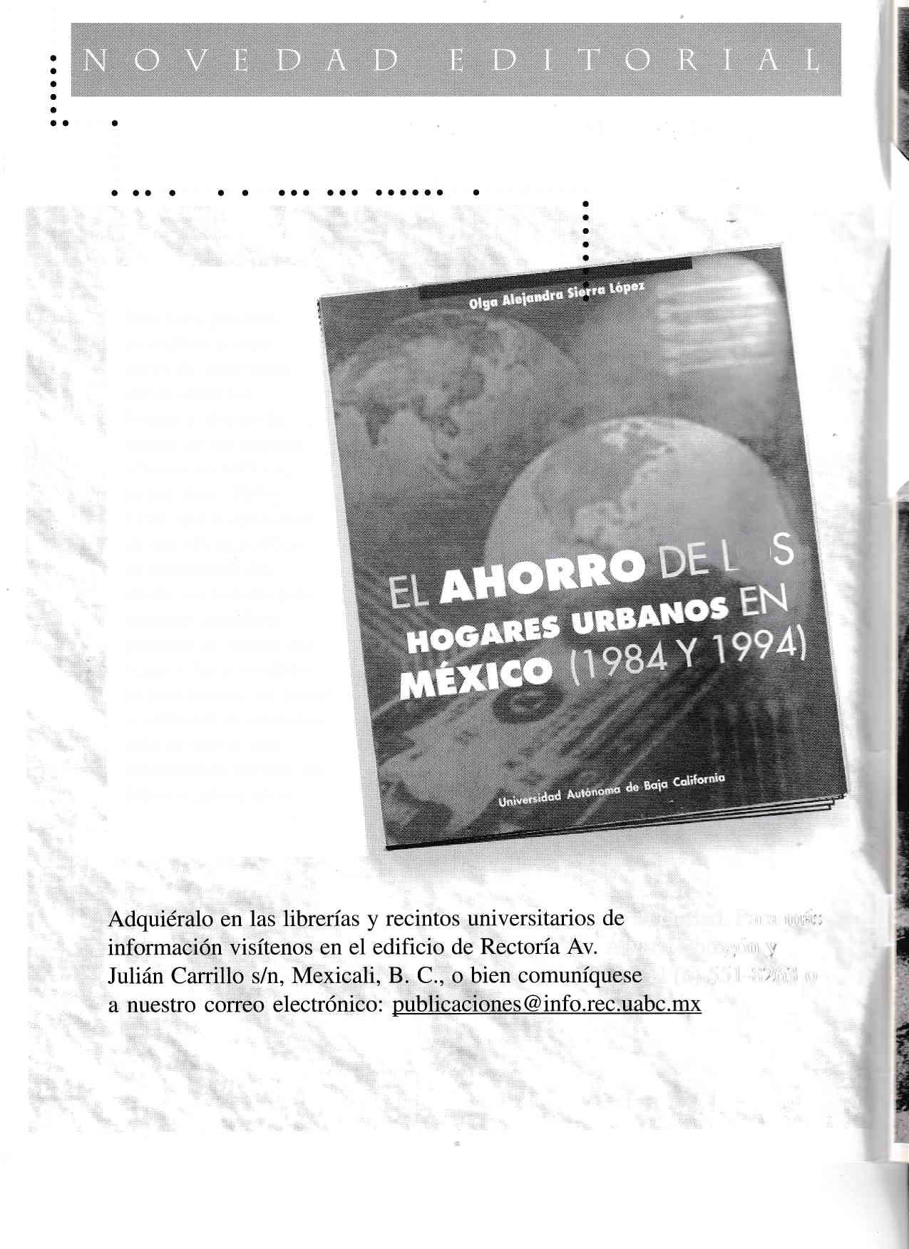 Este libro presenta un análisis comparativo de corte transversal sobre las formas y niveles de ahorro de los hogares urbanos en México, en los años 1984'y 1994, que la aplicación de una eftcaz política de promoción del ahorro en nuestro país requiere considerar patrones de ahorro del hogar y las prioridades de este último, así como el ambiente de estab llización en que se han desarrollado durante los últimos quince años.