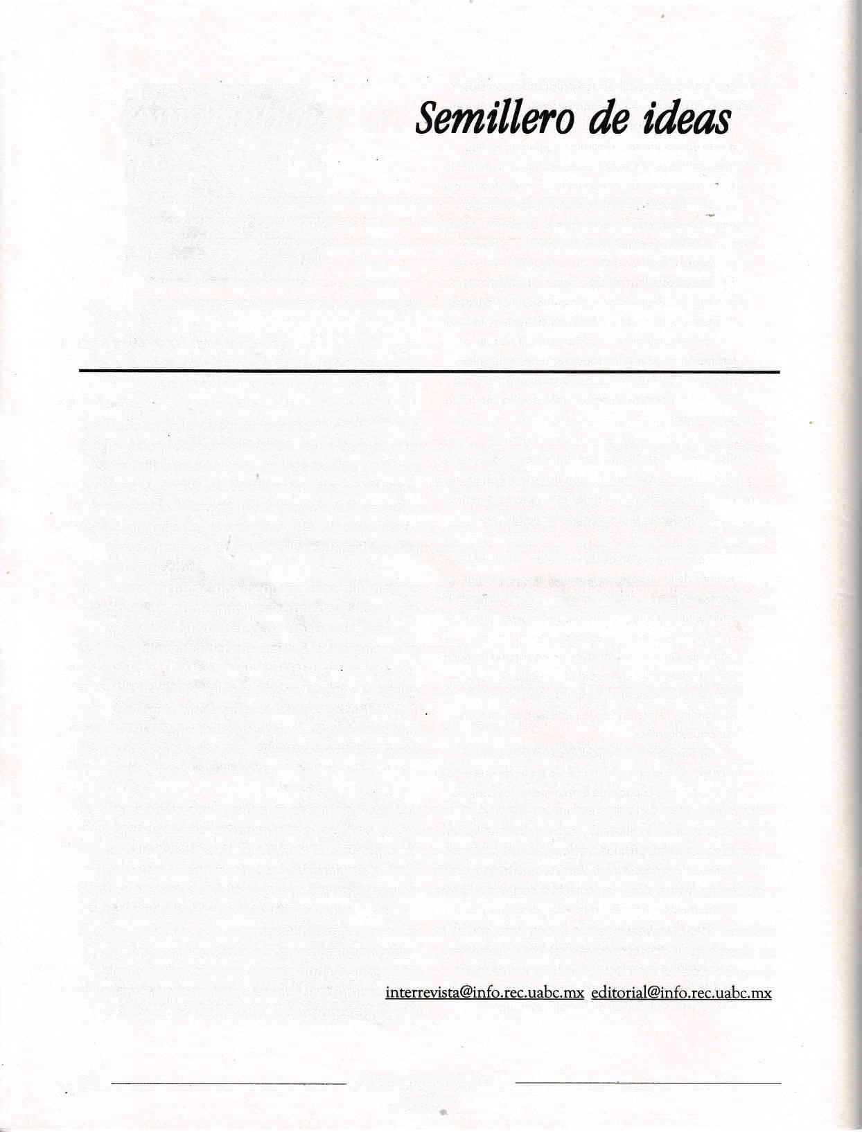 9. Los artículos que se proponen para su publicación deben enviarse al editor responsable de Semíllero de ideas, o a la coordinación general de Req.,is¿a Uniuersitaria, cuyos datos aparecen en el directorio de esta edición. Si tiene alguna duda o sugerencia, por favor háganosla saber por fax, correo, personal. mente, a nuestras direcciones electrónicas: interrevista@info.rec.uabc.mx, editorial@info.rec.uabc.mx, o al teléfono 551-8Z.ZZ, extensiones 3774 y 3276.