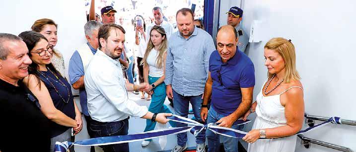 Nesse momento é feito o descerramento da fita, ao lado de Kiko Teixeira, Carla Morando, prefeito Morando e de colaboradoras da unidade