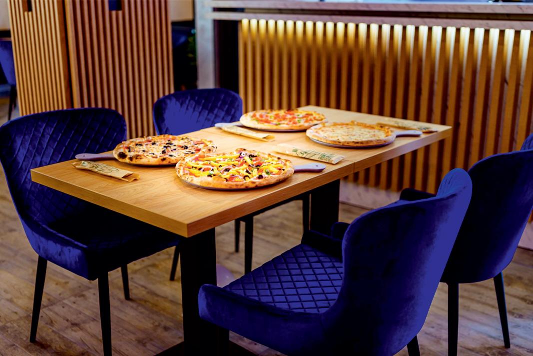 Din meniu, atât pentru servirea în local, cât și pentru livrarea la domiciliu, puteți alege din peste 35 de sor mente de pizza, preparate la cuptorul