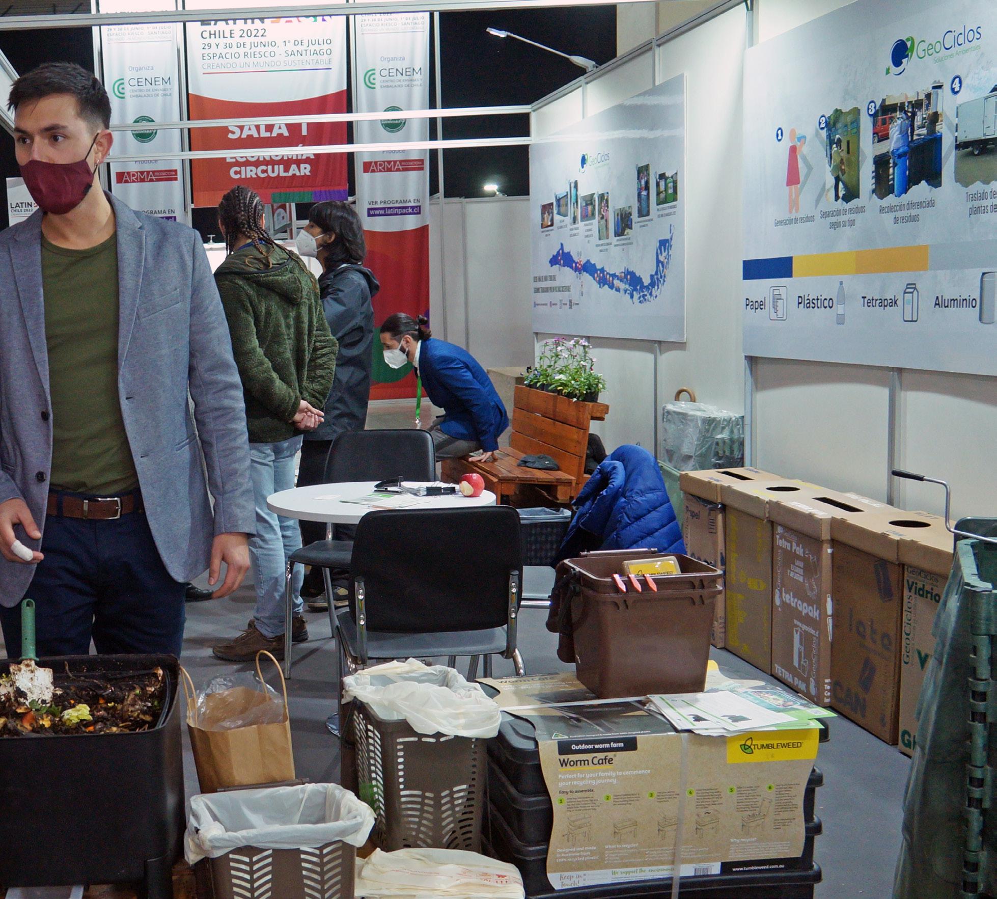 Ha sido una excelente oportunidad de generar contacto, de presentar nuestros de sarrollos que están alineados con la feria de envases y embalajes. Adicionalmente hemos visto que hay mucho interés en el reciclaje, que también es parte de lo que hacemos, estamos dando mucho énfasis a eso, los días han sido desde menor a mayor público. Esperamos seguir recibiendo muchas visitas y que podamos finalmente trabajar en alguna alianza, en algún proyecto colaborativo. Estamos presentando en relación a embalaje bandejas compostables a partir de cascarilla de arroz y bioplástico para el envasado de pollo fresco, proyecto que estamos tra bajando en forma colaborativa con la empresa Bio Gusto; estamos haciendo ensa yos actualmente con condiciones reales de uso con la empresa Ariztía para validar técnicamente este producto y posteriormente introducirlo al mercado, esto está planificado en aproximadamente un año más; también estamos presentando otro de nuestros desarrollo que es para la valorización de orujo de cebada del mismo proceso y fabricación de la cerveza con el cual desarrollamos un material para fabricar un packaging para un six pack de cervezas en lata. Ya lo escalamos a nivel piloto y a nivel industrial. Empresas BCycle son los emprendedores que trabajan con los dueños de la cervecería Becker, este proyecto está actualmente en produc ción para sacar un piloto al mercado; también un envase a partir de cáscaras de nuez para chocolates orgánicos, proyecto que nos asociamos con emprendedores, chocolatería Líquenes. También en temas de reciclaje, desarrollamos un proyecto de reciclaje de mascarillas, obteniendo productos que son fabricados 100 % con estas mascarillas de polipropileno. En esta línea ya estamos a nivel producti vo, ya nos pueden comprar productos como maceteros en la página web, de la universidad. También contamos con alianzas y convenios con distintas empresas, entidades, municipalidades, la gente puede ir como persona natural a depositar sus mascarillas, por ejemplo en Santiago, en el mall Independencia, en Concep ción y en otras regiones y lugares donde se pueden disponer. Estamos fabricando diversos productos bandejas, basureros todo con un 100% mascarilla recicladas. También otro producto que valoriza residuos de la industria de madera son unos pellets que se pueden alimentar en el moldeo por inyección en conjunto con el ácido poliláctico para así generar estas cucharitas que son desechables y que también se pueden compostar. Esos son algunos de los desarrollos que tenemos ahora que son parte de las líneas con el tema de la feria.