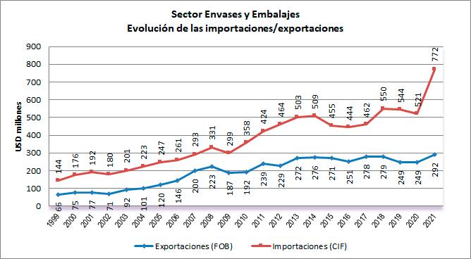 El packaging es esencial en el comercio exterior. Alrededor del 86% de la producción de los envases que se producen en Chile está destinado a la exportación de productos, ya sea por vía directa e indirecta. De acuerdo con cifras institucionales, durante los años 2020 y 2021 ha existido un aumento de los envíos del sector de 14,7%, pasando de aproximadamente US$ 224 millones a US$ 263 millones. Los principales destinos del sector en ese ejercicio fueron Perú (21,9%), Estados Unidos (20,15%), Argentina (14,6%), México (9,4%), Brasil (6,1%) y Ecuador (4,1%).