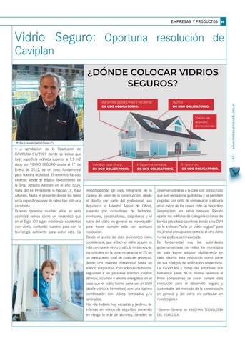 observan vidrieras a la calle con vidrio crudo que son verdaderas guillotinas y se perciben pegadas con cinta de enmascarar o silicona en el mejor de los casos, todo un verdadero despropósito en estos tiempos. Párrafo aparte los edificios de categoría o casas de barrios privados o countries donde a los DVH se le colocan “solo un vidrio seguro” para mejorar el presupuesto como si el otro vidrio nunca pudiera ser impactado. Es fundamental que las autoridades gubernamentales de todos los municipios del país logren adoptar rápidamente en cada distrito esta resolución como parte de sus códigos de edificación respectivos. La CAVIPLAN y todas las empresas que formamos parte de la misma tenemos el firme compromiso de hacer cumplir esta resolución para el desarrollo seguro y sustentable del mercado de la construcción en general y del vidrio en particular en nuestro país.z *Gerente General de KALCIYAN TECNOLOGÍA DEL VIDRIO S.A.