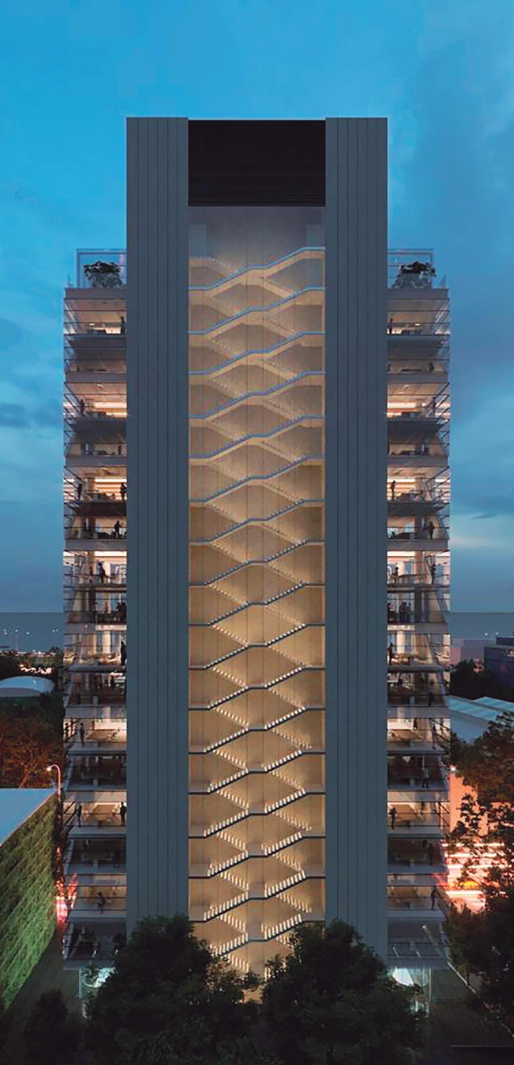 En cuanto a la fachada trasera, que presenta escaleras trenzadas, requería una solución ingeniosa. Inicialmente diseñadas en hormigón, se optó por una estructura mixta de acero y paneles premoldeados de hormigón para superar las dificultades logísticas. “Toda esta fachada, con sus vidrios trapezoidales, se fusiona de manera hermosa y prolija, donde cada corte de vidrio coincide con las líneas de las escaleras. El proceso de tener la escalera pre moldeada y