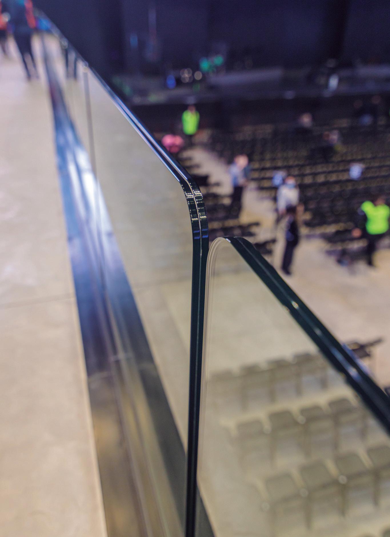 El edificio, totalmente cerrado e insonorizado y con capacidad para quince mil personas es una perla del desarrollo arquitectónico y el diseño de espacios dedicados a eventos y espectáculos masivos. Se destaca por su confort y se encuentra equipado con tecnología de última generación. Uno de los detalles más importantes y llamativos de diseño son las barandas estructurales, que están compuestas por cristal laminado con SentryGIass que se desempeña como un elemento estructural en las construcciones al ser fabricado con interlámina compuesta hasta 100 veces más rígida y 5 veces más resistente en comparación con las interláminas tradicionales. Estas barandas se comportan como compuesto de “diseño tecnológico” que ejerce poca presión mecánica sobre las cargas y ofrece una resistencia notable a las deformaciones después de que el material se rompe, de esta manera se mantiene autoportante incluso con ambos vidrios quebrados. Con este tipo de resistencia, el vidrio puede ser un elemento estructural más activo en la edificación, abriendo posibilidades de diseño que no existían antes.