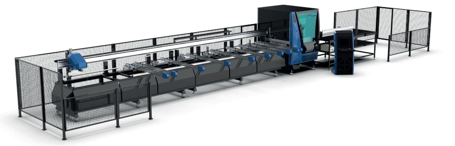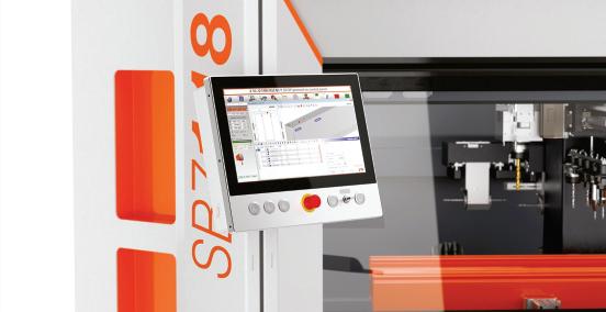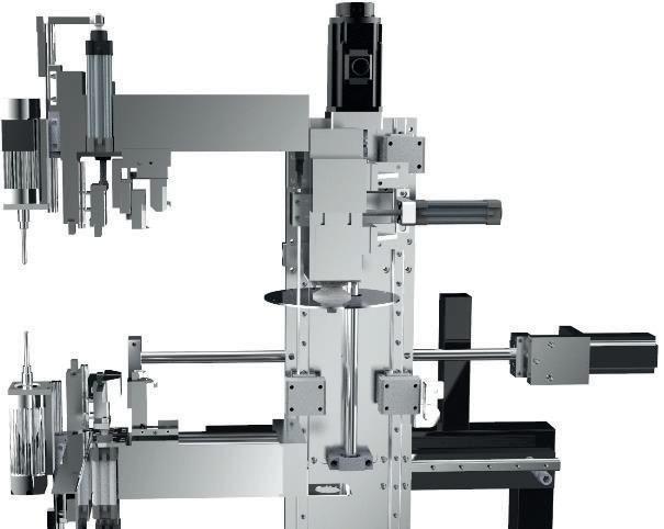 permite efectuar mecanizados difíciles, con precisión y rapidez. El almacén de herramientas de 12 posiciones, integrado en el portal móvil, dispone de dos posiciones específicas para un disco de hasta 250 mm de diámetro y para una unidad angular. Prevé dos modalidades distintas de funcionamiento: la primera, en modalidad monozona, permite mecanizar una sola área de trabajo de barras enteras de hasta 7 m de longitud máxima; la segunda, en modalidad pendular, permite realizar varias piezas en dos áreas de trabajo distintas. En la versión con sistema de movimiento de las mordazas en los ejes H y P, es posible utilizar la máquina en modalidad pendular dinámica, método de trabajo que permite reducir al mínimo los tiempos de parada de la máquina, puesto que facilita el posicionamiento automático de las mordazas en tiempo oculto respecto a los procesos de trabajo del mandril en el campo de trabajo opuesto.
