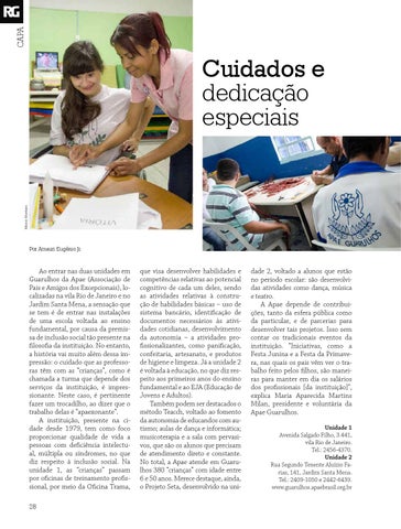 dade 2, voltado a alunos que estão no período escolar: são desenvolvidas atividades como dança, música e teatro. A Apae depende de contribuições, tanto da esfera pública como da particular, e de parcerias para desenvolver tais projetos. Isso sem contar os tradicionais eventos da instituição. “Iniciativas, como a Festa Junina e a Festa da Primavera, nas quais os pais vêm ver o trabalho feito pelos filhos, são maneiras para manter em dia os salários dos profissionais [da instituição]”, explica Maria Aparecida Martins Milan, presidente e voluntária da Apae Guarulhos. Unidade 1 Avenida Salgado Filho, 3.441, vila Rio de Janeiro. Tel.: 2456-4370. Unidade 2 Rua Segundo Tenente Aluízio Farias, 141, Jardim Santa Mena. Tel.: 2409-1050 e 2442-6439. www.guarulhos.apaebrasil.org.br