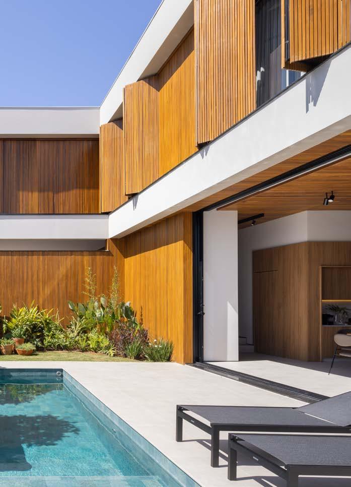 Para somar aos elementos naturais presentes em toda obra, Leonardo e Giovana apostaram nos brises de madeira fornecidos e executados pela JR DECK - Arte em Madeira para serem elementos que proporcionam privacidade e valorizam o desenho arquitetônico. A integração dos ambientes interno e externo é garantida pelas esquadrias de dimensões monumentais da Via Vidro PVC e Alumínio, um convite para aproveitar a piscina assinada pela Clean Pool, com projeto de execução hidráulica e equipamentos que proporcionam, desde automação da piscina a água aquecida o ano todo.