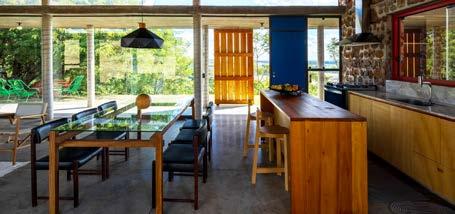 A casa é, segundo sua amiga Tânia Verri, um “programa mínimo”, porque abriga apenas um pavilhão central – o coração social da casa, com cozinha, jantar, living, TV e escritório –, um banheiro, um quarto e um gourmet que se abre para a piscina. Como o pavilhão de vidro do Museu do Pão, a casa é inteiramente de vidro nas faces norte e sul, onde nem mesmo cortinas existem para impedir a entrada da luz e da paisagem surreal do entorno. Painéis móveis de madeira, executados por João Antonelli, cumprem com o papel de sombrear em momentos e locais estratégicos, quando quiser, e se quiser.