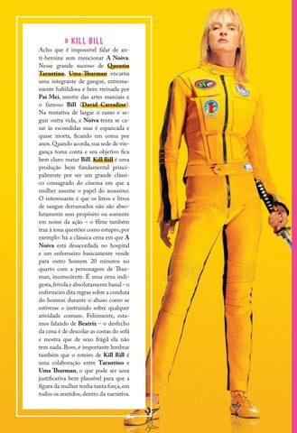 » Kill Bill Acho que é impossível falar de anti-heroína sem mencionar A Noiva. Nesse grande sucesso de Quentin Tarantino, Uma Thurman encarna uma integrante de gangue, extremamente habilidosa e bem treinada por Pai Mei, mestre das artes marciais e o famoso Bill (David Carradine). Na tentativa de largar o ramo e seguir outra vida, a Noiva tenta se casar às escondidas mas é espancada e quase morta, ficando em coma por anos. Quando acorda, sua sede de vingança toma conta e seu objetivo fica bem claro: matar Bill. Kill Bill é uma produção bem fundamental principalmente por ser um grande clássico consagrado do cinema em que a mulher assume o papel do assassino. O interessante é que os litros e litros de sangue derramados não são absolutamente sem propósito ou somente em nome da ação – o filme também traz à tona questões como estupro, por exemplo: há a clássica cena em que A Noiva está desacordada no hospital e um enfermeiro basicamente vende para outro homem 20 minutos no quarto com a personagem de Thurman, inconsciente. É uma cena indigesta, frívola e absolutamente banal – o enfermeiro dita regras sobre a conduta do homem durante o abuso como se estivesse o instruindo sobre qualquer atividade comum. Felizmente, estamos falando de Beatrix – o desfecho da cena é de descolar as costas do sofá e mostra que de sexo frágil ela não tem nada. Bom, é importante lembrar também que o roteiro de Kill Bill é uma colaboração entre Tarantino e Uma Thurman, o que pode ser uma justificativa bem plausível para que a figura da mulher tenha tanta força, em todos os sentidos, dentro da narrativa.