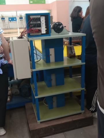 Estudiantes de la especialidad de Electricidad expusieron prácticas de automatización. Se observa la maqueta de un ascensor de tres pisos, con distintas tecnologías aplicadas: Controlador Lógico Programable (PLC), Interfaz Hombre Máquina (HMI) y contactores.