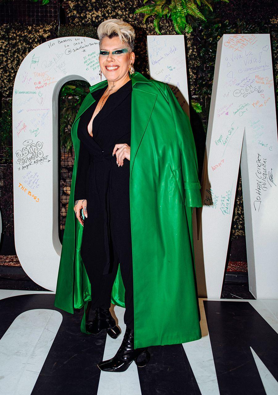 El abrigo es Shrimps, los zapatos son Margiela, la cartera es Telfar y las joyas son A Sinner In Pearls.
