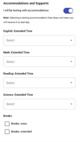 You may then select the exact accomodations you have been approved for, including 50% or 100% extended time and extra, extended, or as-needed breaks.