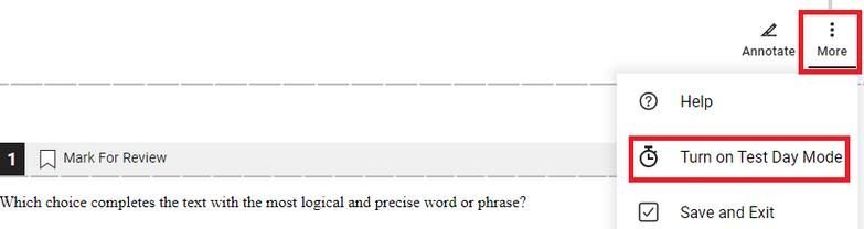 You can then submit answers as soon as they are ready OR submit the section you need to skip ahead to Then you can click the three dots on the top right corner then click Turn on Test Day Mode