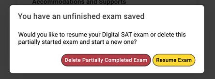 When you launch, you see a modal with message “You have an unfinished exam saved.”