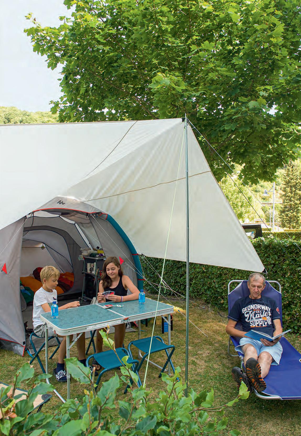 Das leise Geplätscher der Clerve sorgt für ein entspanntes Ambiente, und der schattige Standort mitten im Grünen, wo sich Roger Feitler und seine Enkelkinder niedergelassen haben, liegt genau richtig, um zumindest einen Augenblick der erdrückenden Hitze zu entkommen. Ein kühler Platz im Schatten, wo es sich das Trio in seinem Zelt gemütlich gemacht hat. Liegestuhl, kleiner Klapptisch, Gaskocher und ein bequemer Innenraum wirken tatsächlich auf den ersten Blick, als würden sie aus einem lebensgroßen Bilderbuch stammen. Mitten in dem idyllischen Clerf, nur einige hundert Meter vom bekannten mittelalterlichen Schloss aus dem 12. Jahrhundert entfernt, lässt es sich gut entspannen.