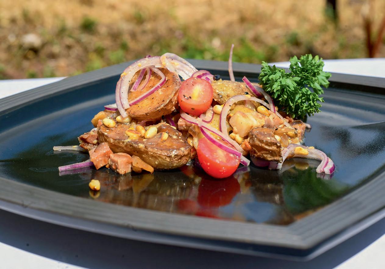 1 kg kleine gekochte Kartoffeln 2 rote Zwiebeln 10 Kirschtomaten 200 g Speck 4 EL Pinienkerne 150 ml Essig 150 ml Gemüsebrühe 4 EL Öl 2 EL Senf Pfeffer