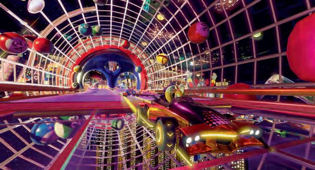 Kontrahenten das Leben zu erschweren. Während den Rennen sammelt man verschiedenste Goodies: Zielsuchende Raketen, Bomben, Hindernisse, die man den Verfolgern in den Weg legt oder einfach einen Turbo, der einen kurzzeitig beschleunigt. Bei Segas Spiel heißen diese Items „Wisps“ und sehen ein wenig wie Geister aus, erfüllen aber genau den gleichen Zweck wie in jedem anderen Fun-Racer auch. Insgesamt gibt es 14 dieser offensiven, defensiven und unterstützenden Hilfen, bis zu drei davon kann man gleichzeitig bei sich tragen und zudem als Abwehr einsetzen, sollte man selbst unter Beschuss geraten. Besonders hilfreich ist die SlideFunktion. Mit der linken Schultertaste bringt man seinen Wagen ganz einfach zum Seitwärtsrutschen, um die engsten Kurven mit Stil und bei voller Fahrt nehmen zu können. Außerdem lädt man so – vorausgesetzt man rutscht lange genug am Stück und man vermeidet eine Kollision – einen Booster in drei Stufen auf, der einem eine zusätzliche, temporäre Beschleunigung verschafft… Käpt’n Kirk würde jauchzen vor Freude.
