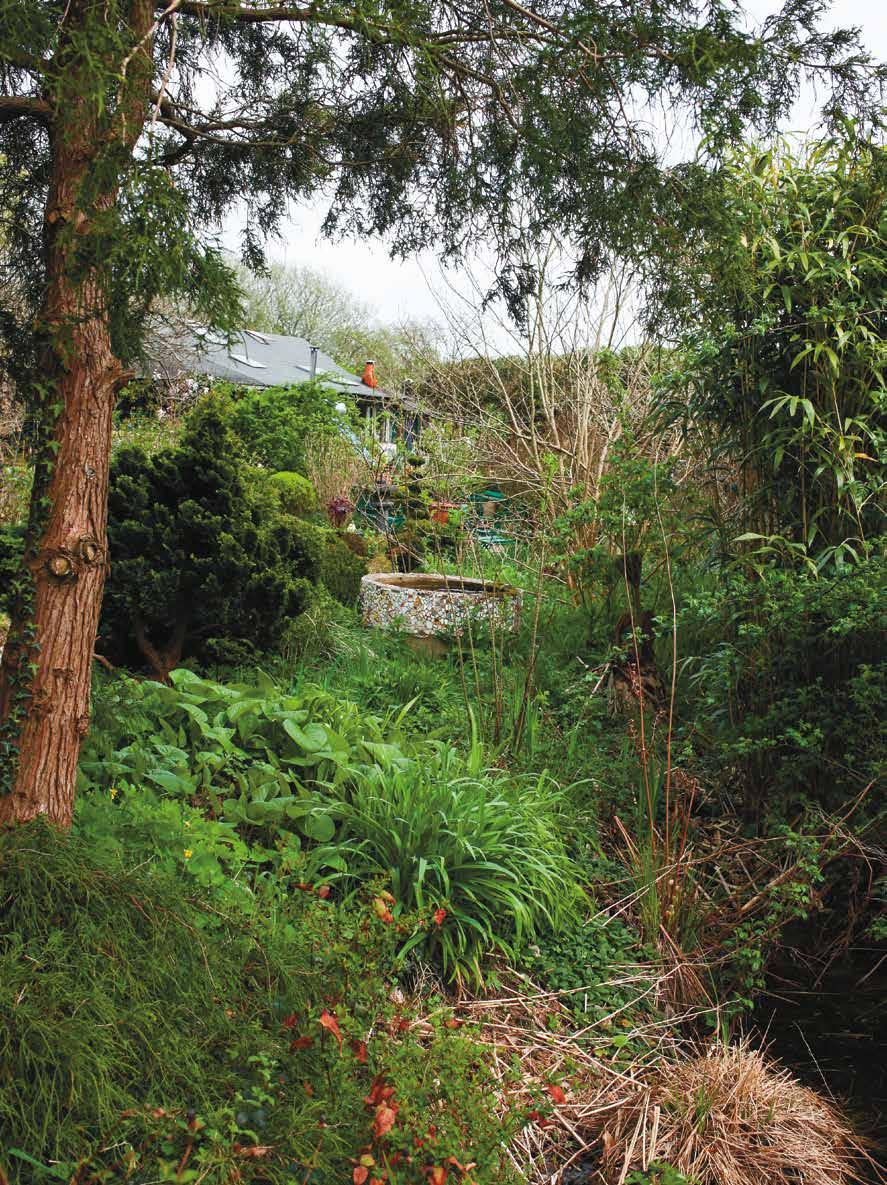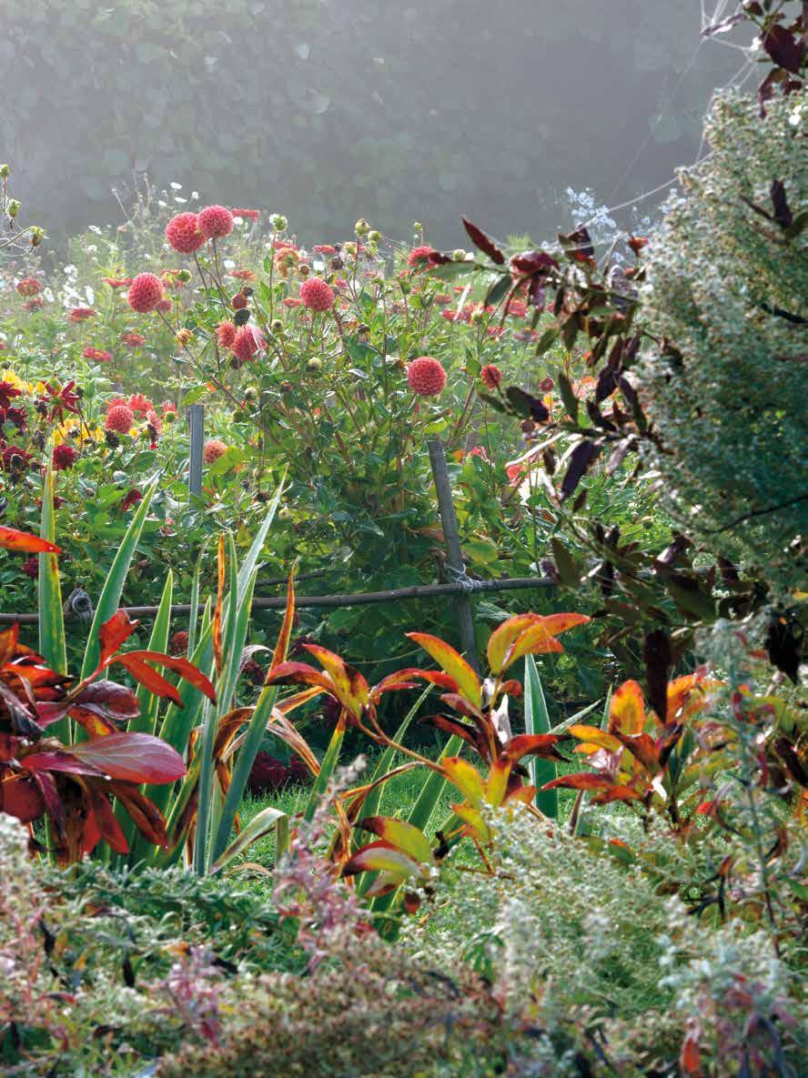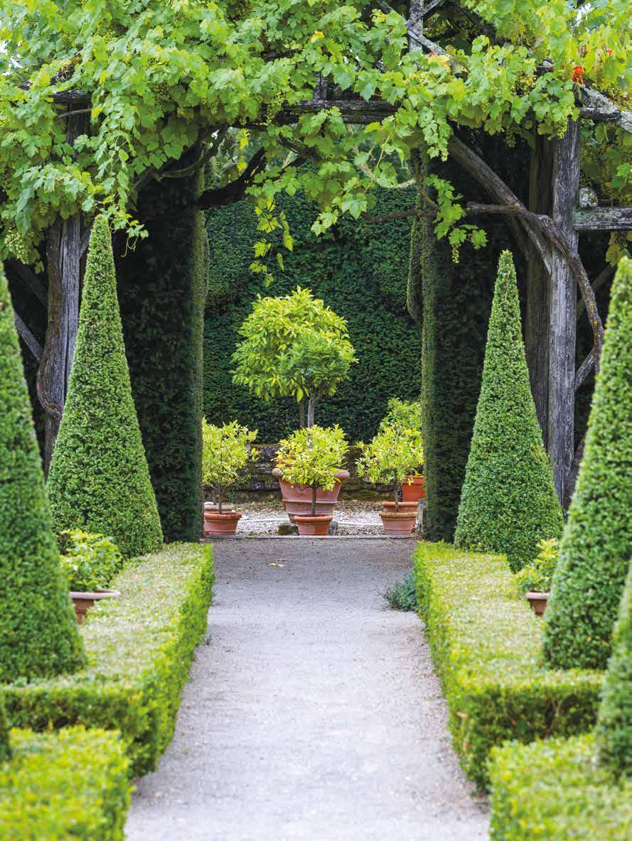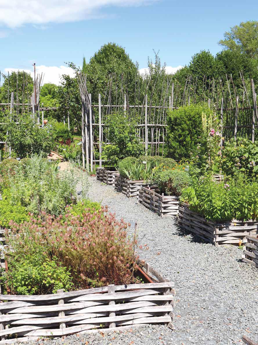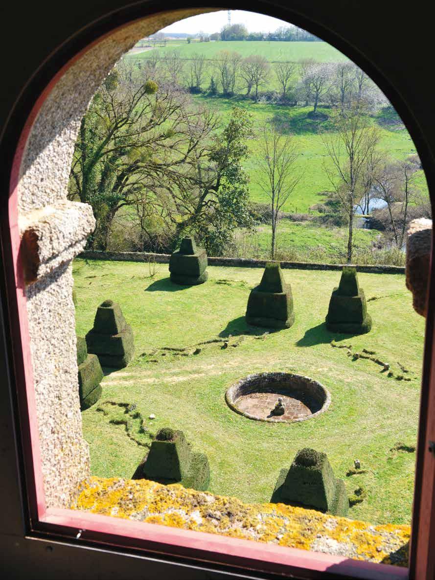 En ce premier dimanche de janvier, la température est glaciale, la neige est annoncée pour les prochains jours. À 16h30, le jour décline déjà. Madame du Boucheron vient m’accueillir sur le seuil de l’orangerie, m’invite à entrer puis me désigne une porte qui s’ouvre vers une salle à manger ; immédiatement la chaleur de la pièce nous enveloppe. Le contraste avec le froid du dehors est réconfortant. Posés à l’extrémité d’une table, une théière fumante et deux mugs nous attendent près d’une cheminée rayonnant d’une généreuse flambée. Les du Boucheron résident dans l’orangerie : « Le château est trop froid ! Le volume des pièces est tel ! » Nous nous asseyons, et sans attendre Anne du Boucheron plante le décor : « Mon arrièrearrière-grand-père a acquis la Baronnière, dans les Mauges, de la marquise de Bonchamps. Le château d’Arthus Bonchamps 1 avait été incendié en avril 1793. Il n’en subsistait qu’une tour d’escalier, sur les vestiges de laquelle a été bâtie la chapelle en 1842-1843. Venez voir, il y a une gravure dans l’entrée ! Le parc a été dessiné en 1838 sur les plans du botaniste et paysagiste André Leroy 2. Sa création comprend un jardin potager clos de murs qui précède la construction du château par René Hodé 3 entre 1854 et 1858. » À la toute fin du mois de septembre dernier, le jardinier du château de la Baronnière, Aurélien Menoury, se rappelait avoir répondu à l’offre d’emploi des propriétaires du château, qui recherchaient un couple de 40 ans pour l’entretien du domaine : « Moi, j’étais célibataire et j’avais vingt ans : tout divisé par deux ! Mais après un temps à l’essai, j’ai été embauché ! » À cette époque, à part de maigres planches, l’herbe et les ronces dominaient dans le jardin. Les allées du parc étaient encombrées elles aussi, avec des arbres dans tous les sens : « Le projet de madame du Boucheron était d’avoir un beau jardin. J’ai eu la chance d’arriver à ce moment-là. Le cadre était magnifique. Tout s’est fait au fur et à mesure, j’ai fait beaucoup d’heures mais c’était super ! » Anne du Boucheron poursuit : « On a repris la Baronnière il y a près de vingt ans, après quinze années passées en Belgique. » C’est là qu’elle a beaucoup appris, fréquenté un groupe de botanistes et mesuré la chance d’avoir côtoyé des journalistes du jardin, leaders en environnement, et surtout les mains dans la terre. Grâce à son groupe belge, la visite près de Dublin d’un jardin circulaire agit comme une révélation : « Un jour, quand j’aurai un jardin, je le dessinerai tout en rond ! »