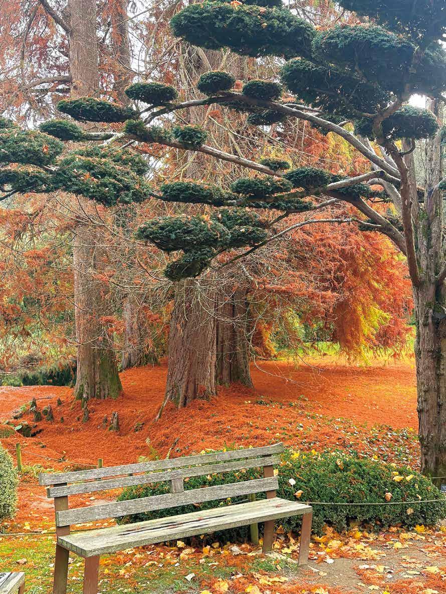 Vue des cyprès chauves aux couleurs automnales du parc oriental de Maulévrier, avec, au premier plan, un arbre taillé en nuages. Les excroissances au pied de Taxodium distichum (nom latin du cyprès chauve) sont des racines aériennes, ou pneumatophores.
