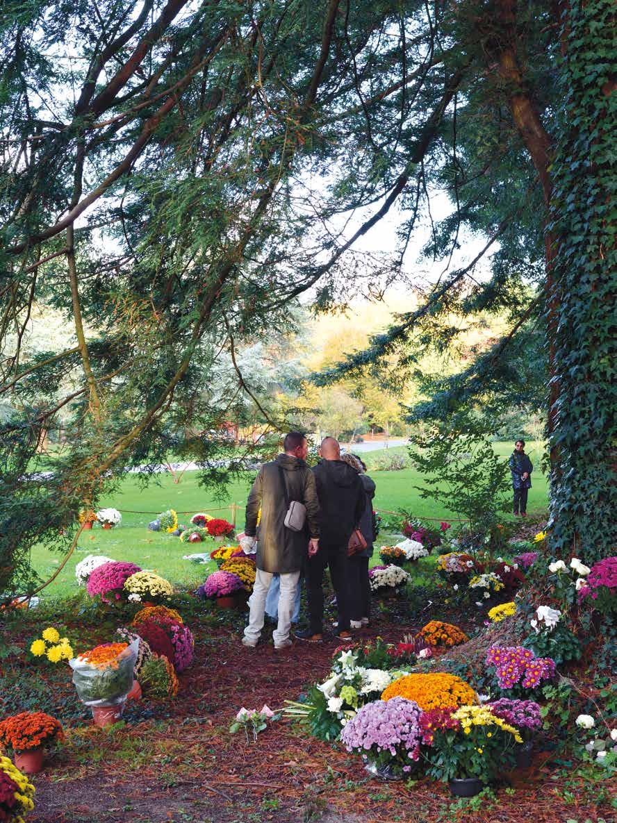 Tous les ans, à l’approche de la Toussaint, ma mère prépare une jardinière de dipladénias. Des roses, des blancs, des rouges… Joyeuses fleurs en trompette, résistantes au manque d’eau, qui ornent le temps de quelques semaines la tombe de sa propre mère, et qu’elle retire au cœur de l’hiver. Un tel rituel jardinier est inscrit dans les habitudes de nombreuses familles qui viennent chaque année, à cette période, se recueillir sur les tombes de leurs proches. Au titre des ornements floraux, les chrysanthèmes sont désormais fleurs-reines dans le Royaume des morts. Pourtant, la « marguerite des morts », comme la chantait Georges Brassens, n’a pas toujours eu sa place sur les tombes. Ce n’est d’ailleurs qu’au xixe siècle qu’il est devenu courant de se rendre dans les cimetières et, à l’époque, c’étaient plutôt des bougies que l’on avait l’habitude de déposer sur les pierres tombales. Comme le rappelle Marc Faudot dans son livre Les cimetières : des lieux de vie et d’histoires inattendues (2023), la généralisation des chrysanthèmes pour le fleurissement des sépultures date de 1919 : « Pour la célébration du premier anniversaire de l’armistice de la guerre de 1914-1918, le président Raymond Poincaré appela les Français à fleurir, le 11 novembre, toutes les tombes des soldats morts à la guerre. Le chrysanthème d’automne s’imposa car il fleurit à cette époque et résiste au froid. Ce fleurissement se décala progressivement au 1er novembre et s’étendit aux tombes familiales 1 » Et la tradition est aujourd’hui encore très ancrée, comme en ce jour de Toussaint au cimetière-parc où nous avions décidé de nous donner rendez-vous avec mon complice photographe Bernard Renoux. Sous les rayons résistants d’un doux soleil de novembre, nous avons déambulé dans les allées pendant un bon couple d’heures, devisant de choses et d’autres, admirant l’aménagement de certaines tombes et la beauté des arbres, dont certaines espèces exotiques m’étaient inconnues. Ce cimetière paysager, qui s’étend sur quelque vingt-cinq hectares au nord de Nantes, à la lisière du périphérique, a été pensé au milieu des années 1940 comme une vaste nécropole pouvant accueillir l’ensemble des dépouilles afin de résoudre le problème de saturation des cimetières nantais. Face au coût engendré par le transfert des corps, le projet est finalement abandonné et le cimetière-parc dans sa forme actuelle est inauguré le 2 mars 1979.