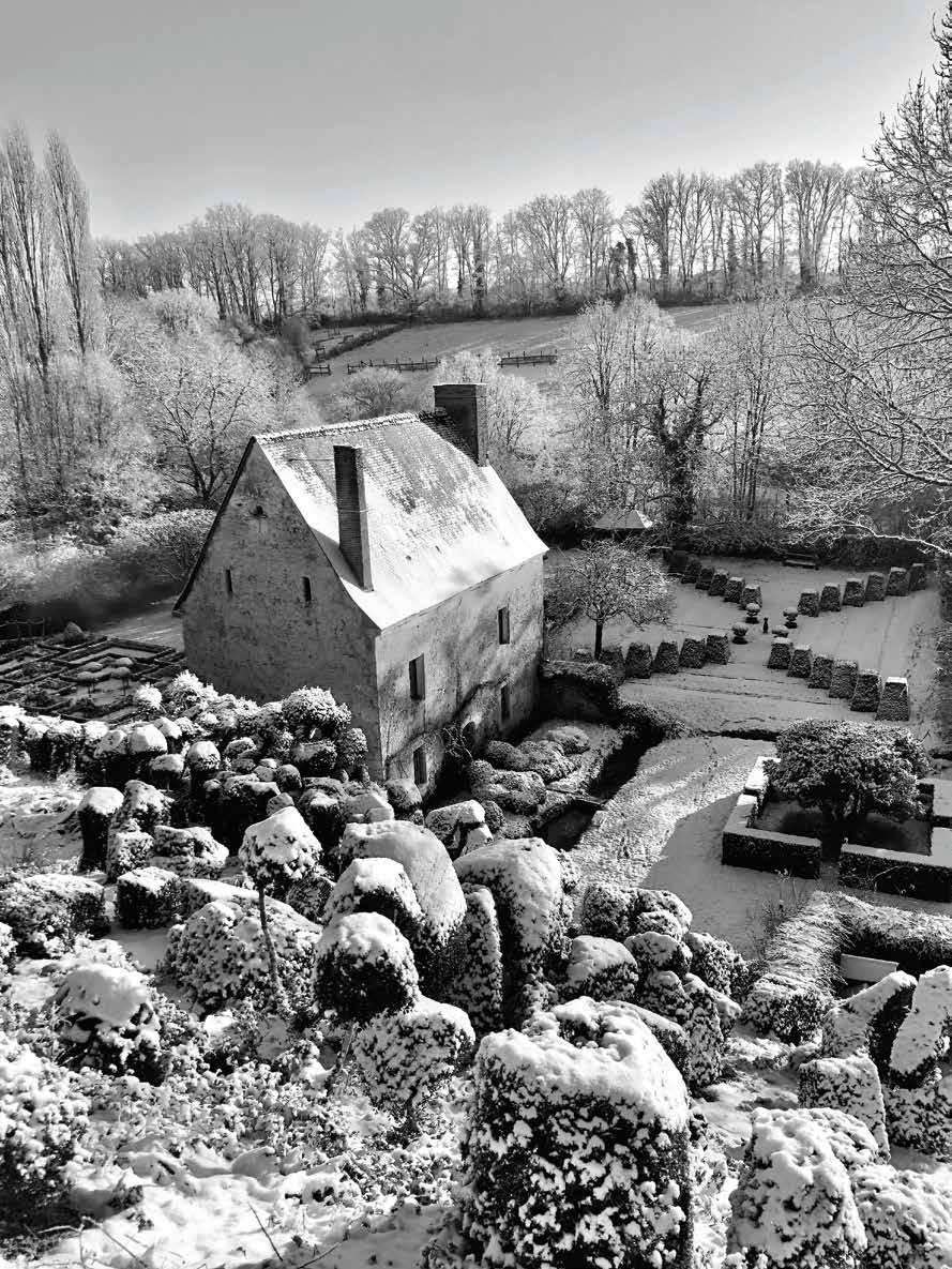 Le logis du prieuré de Vauboin, du xviie siècle, sous la neige. Le jardin de buis a été entièrement créé par son propriétaire, Thierry Juge, à partir de 1991. Au premier plan, sur le coteau, des buis taillés aux formes irrégulières ; en contrebas, une partie du jardin structuré aux topiaires géométriques.