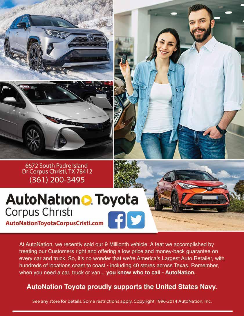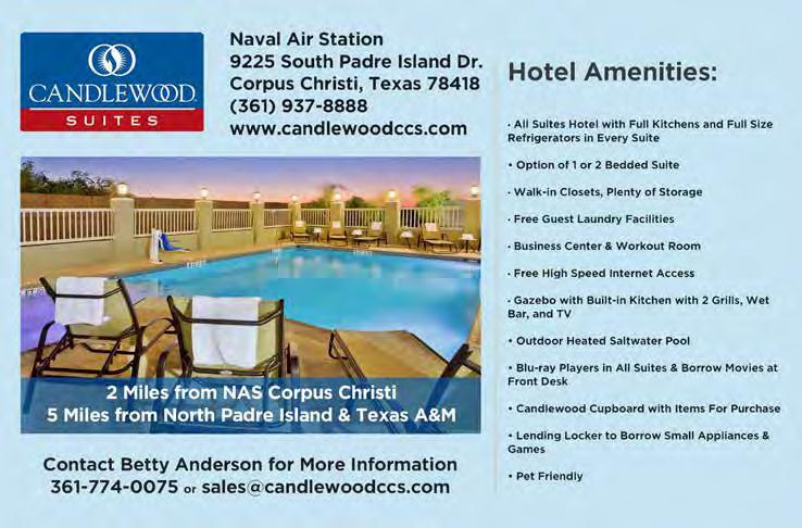 e Naval Air Station is located on the south side of Corpus Christi Bay, just before the causeway that crosses over to Padre Island. Drivers should follow Texas Highway 358/South Padre Island Drive to the NAS Drive exit (clearly marked with NAS-CCAD exit signs). e Main Gate is located one mile from the causeway bridge and is open 24 hours a day. (Ocean Drive provides a beautiful coastline ride from Corpus Christi to the base’s North Gate, but that gate is only open weekdays from 5 a.m. until 8:30 a.m., and 1:30 p.pm to 5 p.m.)
