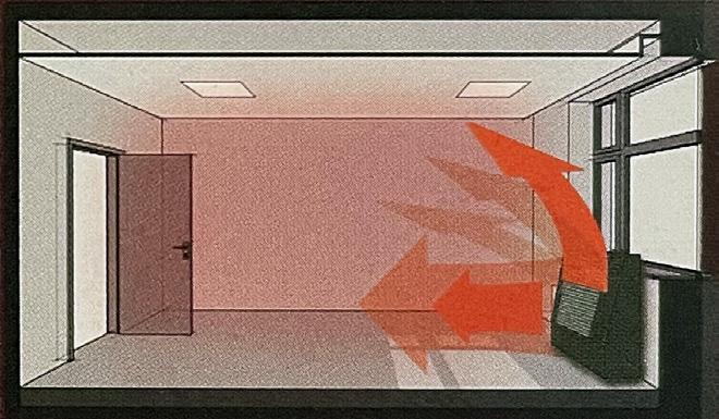 Infraraudonieji spinduliai šildo ne tik orą, bet ir aplink esančius objektus. Šiluma pasiskirsto tolygiai, nereikia ventiliatoriaus. Pakanka vėdinimo pagal statybos reglamentus.