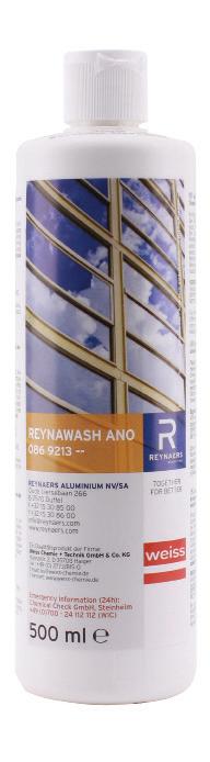 Besproei het oppervlak overvloedig met water om zand of los vuil te verwijderen. Breng de Reynawash Ano-reiniger aan op een pluisvrije, licht vochtige doek. Reinig het oppervlak door verticaal te vegen. Wrijf niet in cirkels tijdens het reinigen. Na afloop veegt u nogmaals met een natte doek.