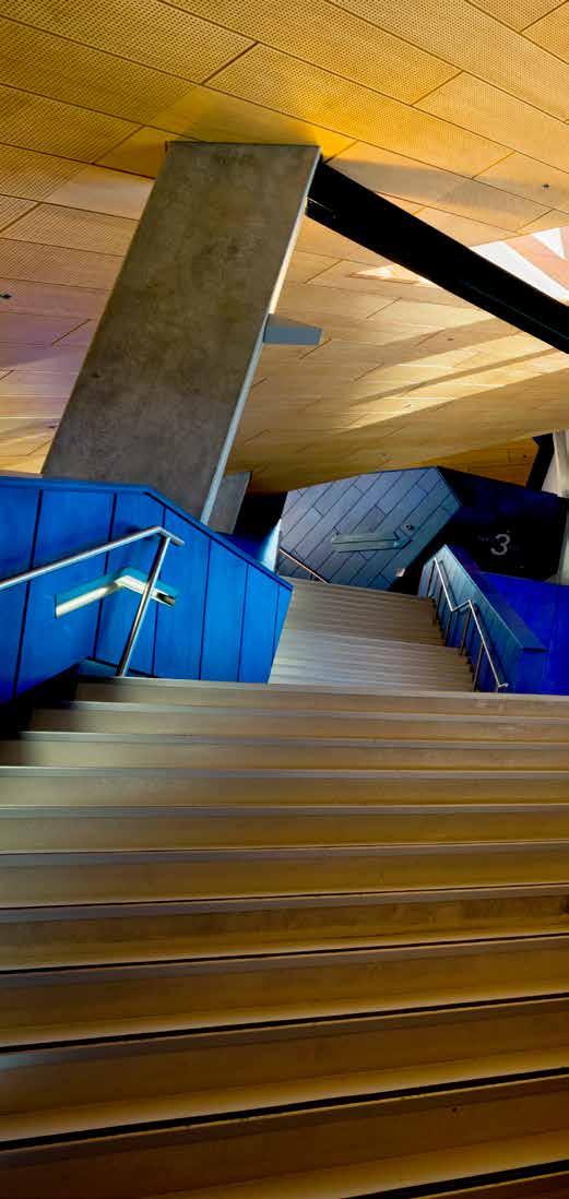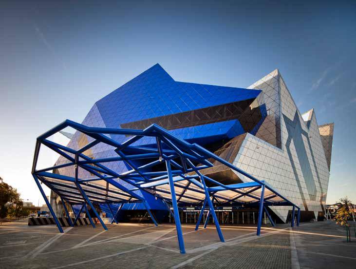The idea of the puzzle can be extended to the very essence of the building. Containing a flexible concert venue and sporting events stadium with a capacity of 15.000 people, where coaches can drive directly onto the arena floor, and featuring five multipurpose function rooms, a 686-bay car park in the basement, a 56-metre by 35-metre retractable roof that opens in just seven minutes, 36 corporate suites, and half a dozen food and beverage outlets; the building is highly complex. Interlocking basket- ball courts slide over tennis courts. It is easy to see how a puzzle became the vehicle for its external expression. Its sheer multi-functionality makes Perth Arena an impressive giant 3D puzzle and piece of architecture.
