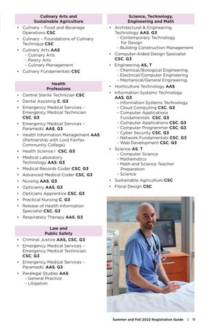 Culinary Arts and Sustainable Agriculture Culinary – Food and Beverage Operations CSC Culinary – Foundations of Culinary Technique CSC Culinary Arts AAS - Culinary Arts - Pastry Arts - Culinary Management Culinary Fundamentals CSC Health Professions Central Sterile Technician CSC Dental Assisting C, G3 Emergency Medical Services – Emergency Medical Technician CSC, G3 Emergency Medical Services – Paramedic AAS, G3 Health Information Management AAS (Partnership with Lord Fairfax Community College) Health Science I CSC, G3 Medical Laboratory Technology AAS, G3 Medical Records Coder CSC, G3 Advanced Medical Coder CSC, G3 Nursing AAS, G3 Opticianry AAS, G3 Opticians Apprentice CSC, G3 Practical Nursing C, G3 Release of Health Information Specialist CSC, G3 Respiratory Therapy AAS, G3
