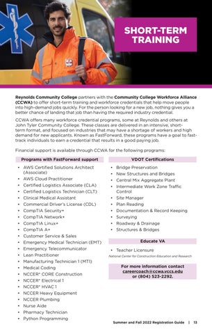 Reynolds Community College partners with the Community College Workforce Alliance (CCWA) to offer short-term training and workforce credentials that help move people into high-demand jobs quickly. For the person looking for a new job, nothing gives you a better chance of landing that job than having the required industry credential. CCWA offers many workforce credential programs, some at Reynolds and others at John Tyler Community College. These classes are delivered in an intensive, shortterm format, and focused on industries that may have a shortage of workers and high demand for new applicants. Known as FastForward, these programs have a goal to fasttrack individuals to earn a credential that results in a good paying job. Financial support is available through CCWA for the following programs: Programs with FastForward support