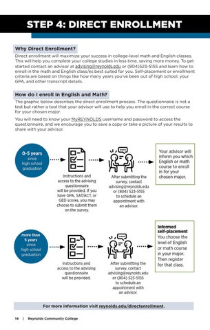 STEP 4: DIRECT ENROLLMENT Why Direct Enrollment? Direct enrollment will maximize your success in college-level math and English classes. This will help you complete your college studies in less time, saving more money. To get started contact an advisor at advising@reynolds.edu or (804)523-5155 and learn how to enroll in the math and English class/es best suited for you. Self-placement or enrollment criteria are based on things like how many years you’ve been out of high school, your GPA, and other transcript details.