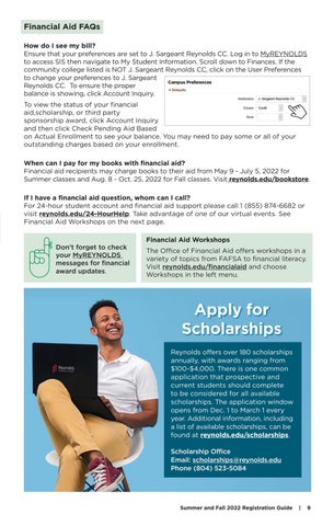 Financial Aid FAQs How do I see my bill? Ensure that your preferences are set to J. Sargeant Reynolds CC. Log in to MyREYNOLDS to access SIS then navigate to My Student Information. Scroll down to Finances. If the community college listed is NOT J. Sargeant Reynolds CC, click on the User Preferences to change your preferences to J. Sargeant Reynolds CC. To ensure the proper balance is showing, click Account Inquiry. To view the status of your financial aid,scholarship, or third party sponsorship award, click Account Inquiry and then click Check Pending Aid Based on Actual Enrollment to see your balance. You may need to pay some or all of your outstanding charges based on your enrollment. When can I pay for my books with financial aid? Financial aid recipients may charge books to their aid from May 9 - July 5, 2022 for Summer classes and Aug. 8 - Oct. 25, 2022 for Fall classes. Visit reynolds.edu/bookstore. If I have a financial aid question, whom can I call? For 24-hour student account and financial aid support please call 1 (855) 874-6682 or visit reynolds.edu/24-HourHelp. Take advantage of one of our virtual events. See Financial Aid Workshops on the next page.
