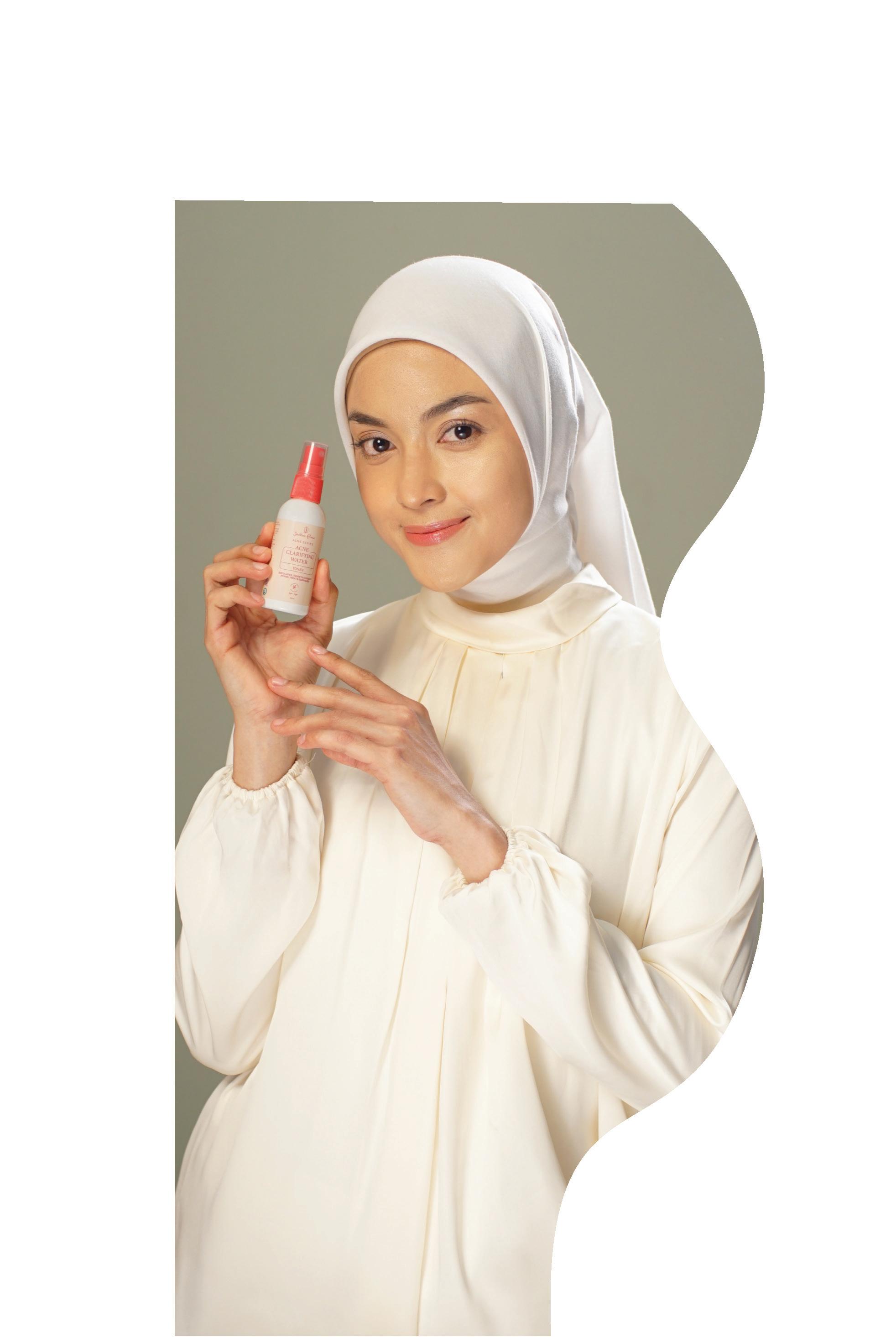 Atau semprotkan langsung ke toner pada wajah dengan jarak 20-30 cm