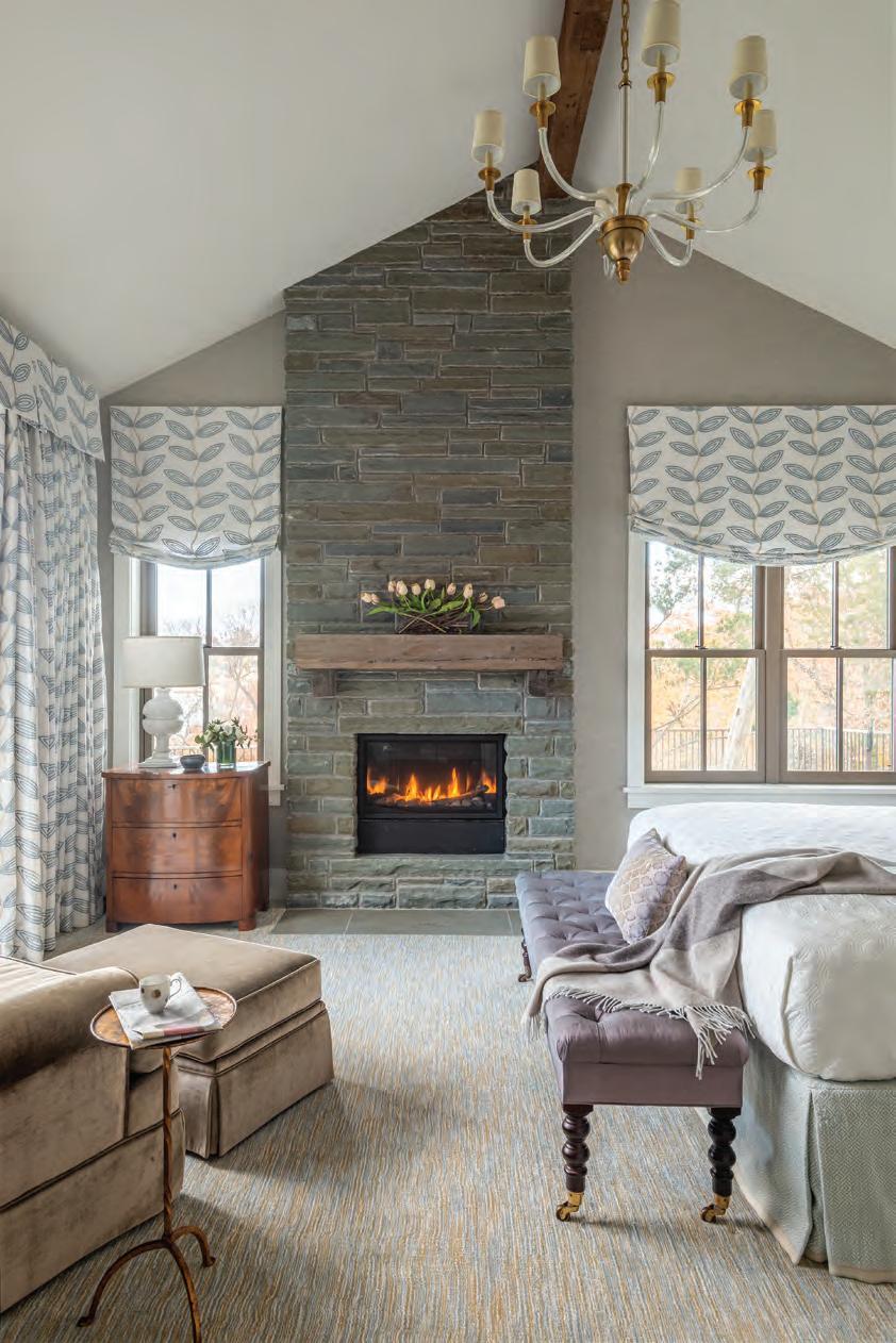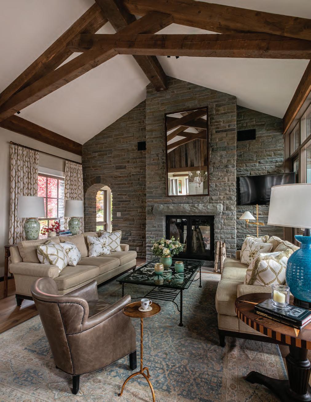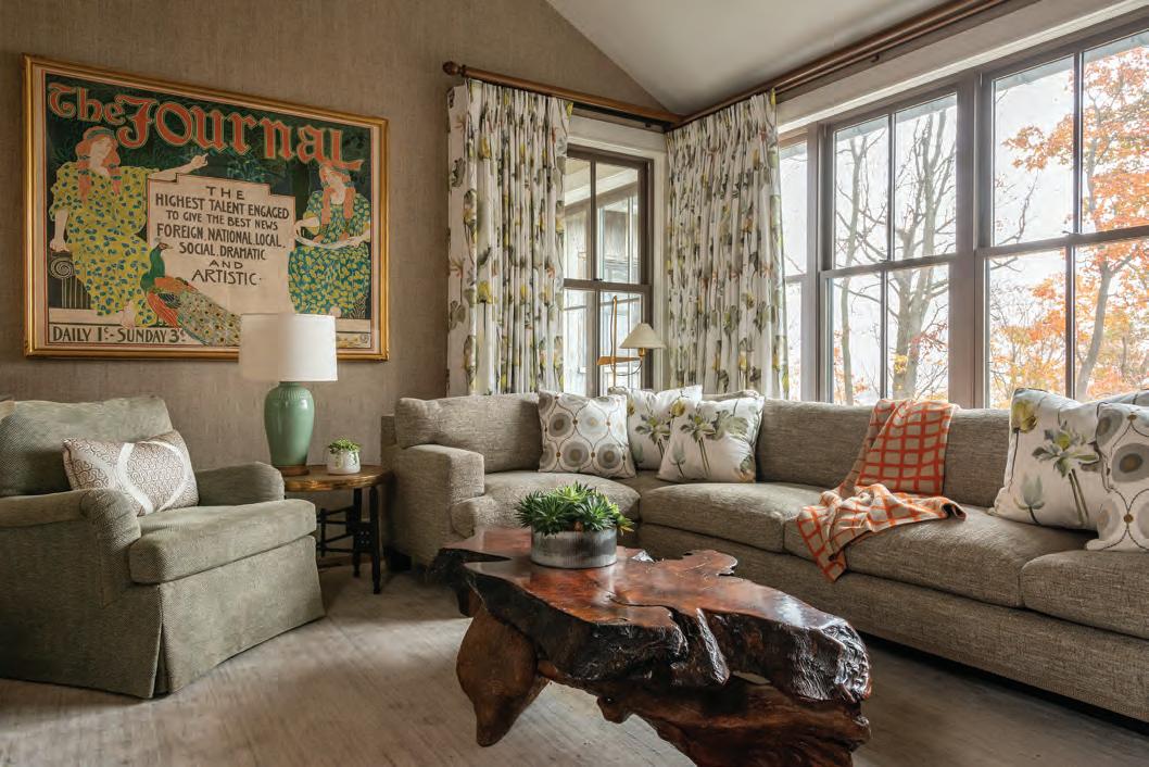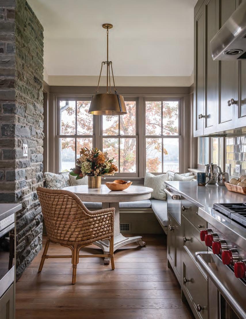 The cozy dining nook overlooks the Hudson River and provides a private corner for morning coffee. ABOVE: Drawing upon nature as inspiration, interior designer Alan Tanksley maintained a subtle approach with the color scheme through upholstery and window dressings while adding pops of interest with tasteful patterns. RIGHT: The main living area is functionally comfortable and elegant with an eclectic blend of casual fabrics and patterns. The scissored trusses add a sculptural element that highlights the traditional architectural details.