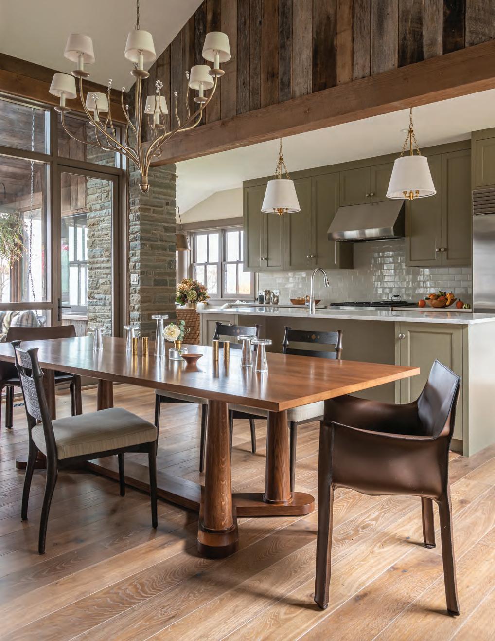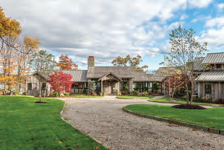 Looking over the Hudson River Valley, the site of this house offered a natural view that defined its linear layout. JLF utilized the tree canopy for natural cooling in the summer, yet they recognized that those areas would be exposed to sunlight in the winter. So they responded with fluid spaces that connect indoor and outdoor living through the seasons. The threebedroom house features a contemporary open living and dining space, a screened three-season porch, an outdoor pool, and a two-car garage. A reclaimed palette of materials was used in the design. While the siding and timbers largely came from Montana and throughout the West, the proportion of the roofline and volume of building were in keeping with the vernacular language of traditional structures throughout the rural Northeast. Blue stone harvested from upstate New York was incorporated in structural walls that allude to the stacked walls that thread across the landscape of the region. JLF pulled the essential forms of the building apart with the use of a glass connector, stone walls as accents, and varying rooflines to allay the effect of a large looming house that would appear out of context.