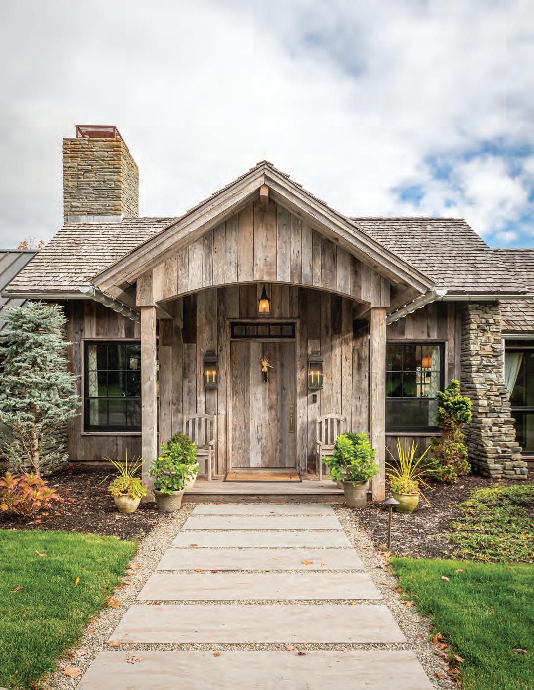 RIGHT: The classic form of a pitched roof and cedar shake shingles that are frequently applied in other structures throughout the area was utilized in combination with vertical recycled siding to elongate the presence of the entryway. Outdoor lighting was used to give a nod to the Early American style.