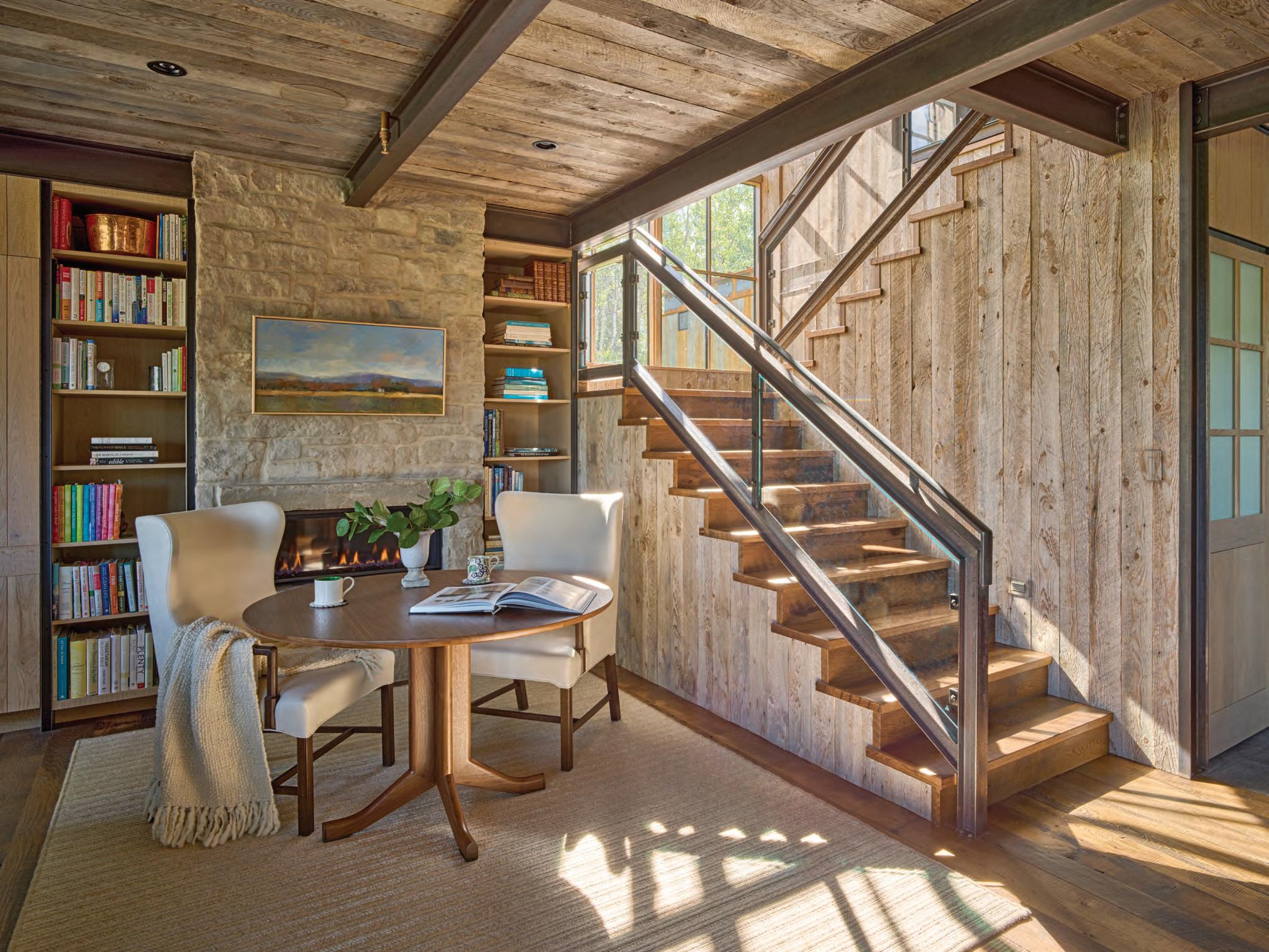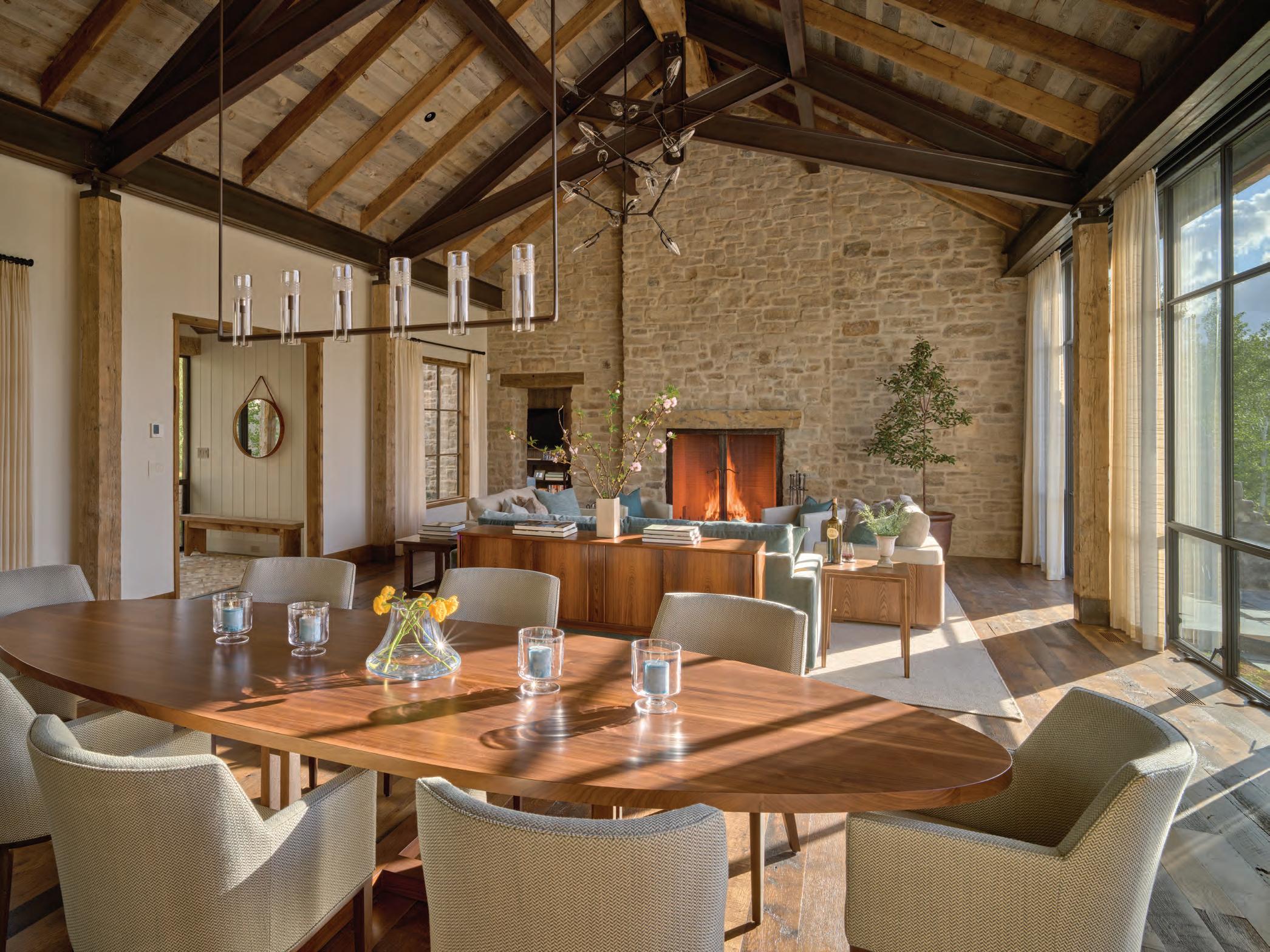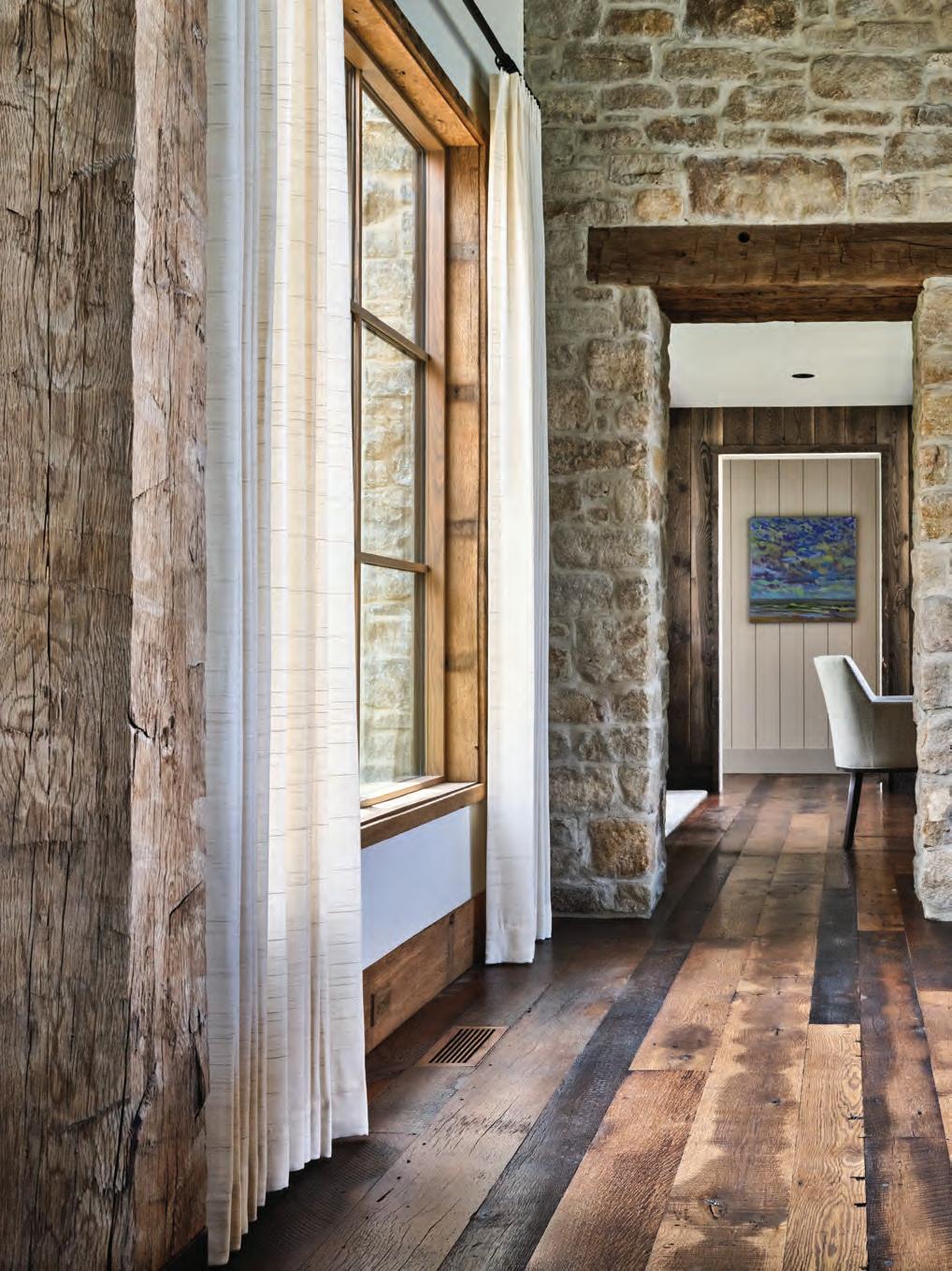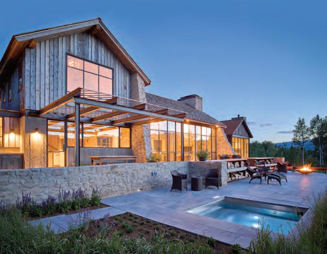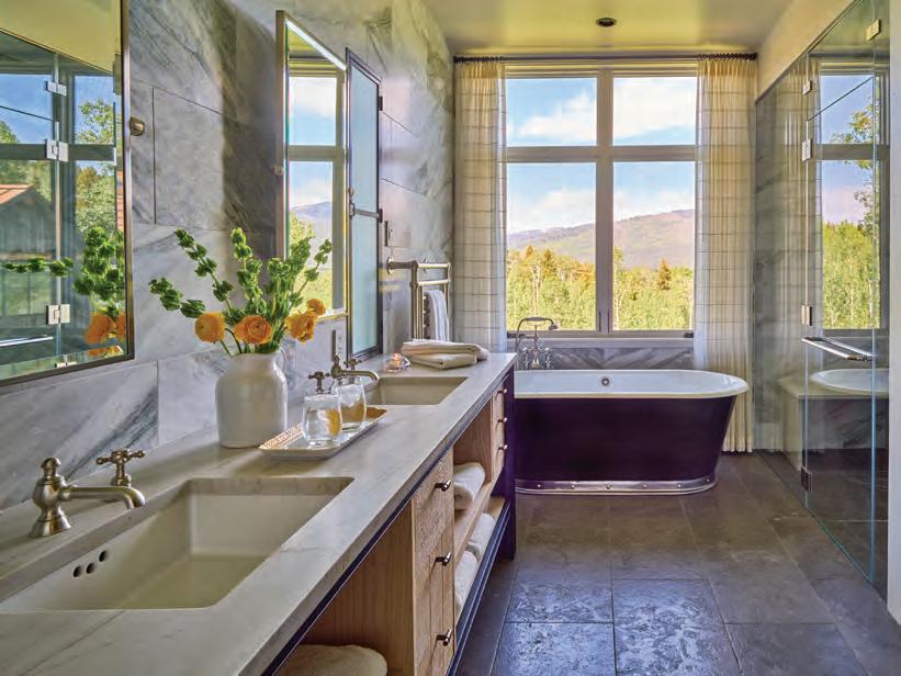 This bespoke house represents a unique marriage of modern and traditional architectural elements. Our design-build team joined a trusted interior designer from concept to completion. The union created the opportunity to work with the client in an intimate, effective way that resulted in the maximum level of personal detail throughout the house. From the finish on the wood inspired by tobacco farm buildings in Tennessee down to the shelf space for spices in the pantry, this customdesigned house is about the details. The collaboration between all of us allowed for the realization of a deeply personal, respectful, and outstanding structure. With the directive that the house should not overshadow the surrounding natural beauty, it was built into the hillside amidst a stand of aspens. There is a sense of arrival stepping down to enter the house. As you approach the glass doors, mountains become a part of the room. A wall of windows frames the foreground of quaking aspens and then leads one’s eyes to the horizon, where nearly the whole length of the Teton Range unfurls. This view was selected over the urge to orient the house toward the Grand Teton. Instead, we opted to let the mountains impress and inspire awe with their full power, telling a story of place that spans from Teton Pass north toward “The Grand” and into the deep wilderness of Grand Teton National Park. Ultimately the great room vista centers on four significant peaks: Cody, No Name, Rendezvous, and The Grand. More glass than wall, the main living area is enveloped in windows that capture light, but the contrast of ancient heavy timbers and a large fireplace on a wall of Montana stone that reaches to the vaulted ceiling maintains the tether to history. In the kitchen the ceiling lowers to an intimate 10-foot height and the hearth room wraps around a person like a comforting embrace. That sense of ease pervades from room to room, offering spaces that expand and contract for entertaining a large crowd or cozying up as a couple.