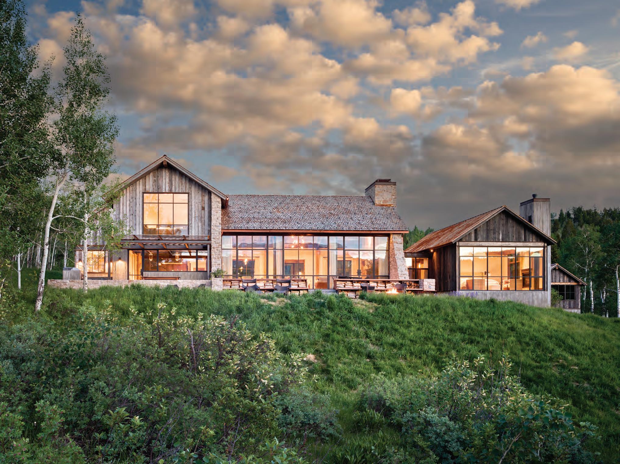 PAGES 242-243: Contoured along the edge of a meadow lined by aspen trees, the private side of the house features a western orientation with windows that capture vistas and allow natural light to flood into the house.