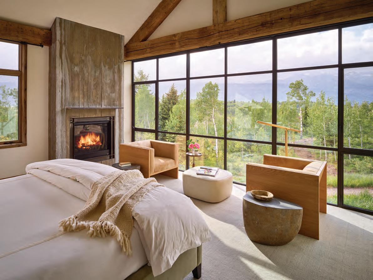 PAGES 252-253: In the hearth room WRJ Design created an intimate nook to scale the space for quiet daily use. LEFT: Simplicity equates to serenity in the primary bedroom. The fireplace is built from board-formed concrete for a contemporary nod to the traditional building material of wood. ABOVE: An enamel soaking tub looks toward views of an aspen grove outside. Dual sinks at a white granite vanity keep the primary bathroom modern and functional.