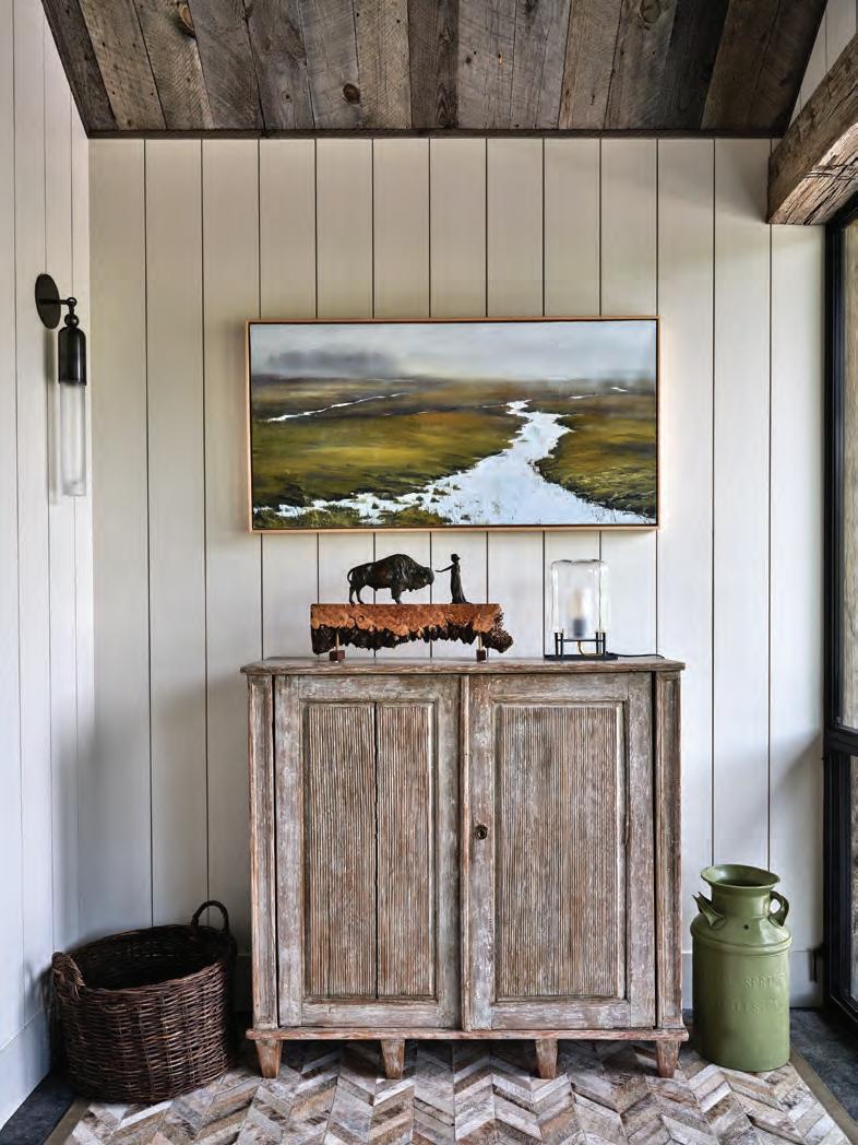 PAGES 248-249: The open kitchen features a custom-forged hood that facilitates the central island as a gathering space between the dining and living areas. LEFT: Carefully curated materials of wood and stone combine to create experiences for people even in spaces that are merely transitional areas that link one room to the next. ABOVE: Original artwork from Wyoming artists grounds the house to the community and celebrates the wild beauty of the region.
