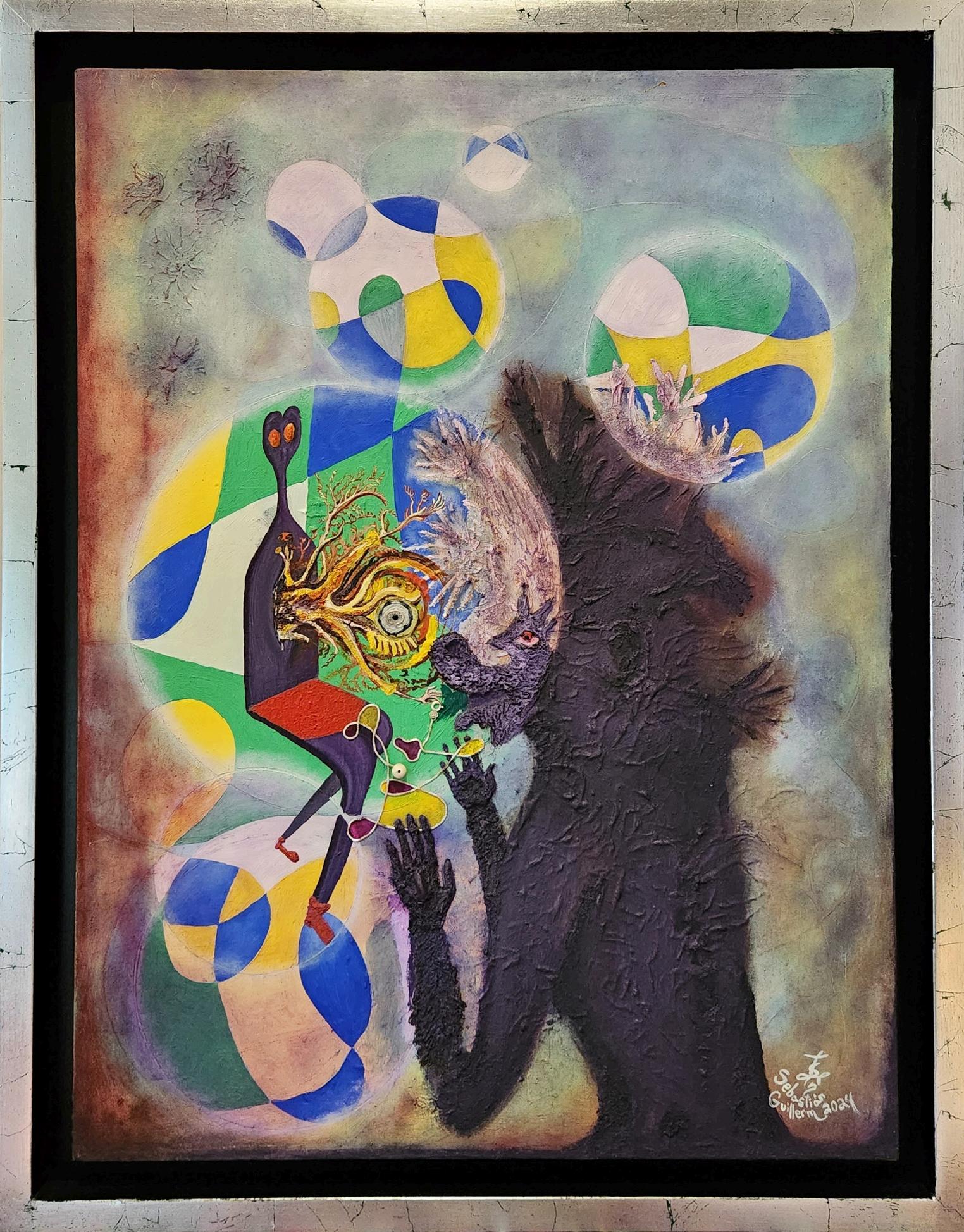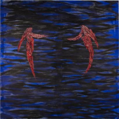 Encuentro, 2025, óleo y tinta china sobre tela, 120 x 120 cm