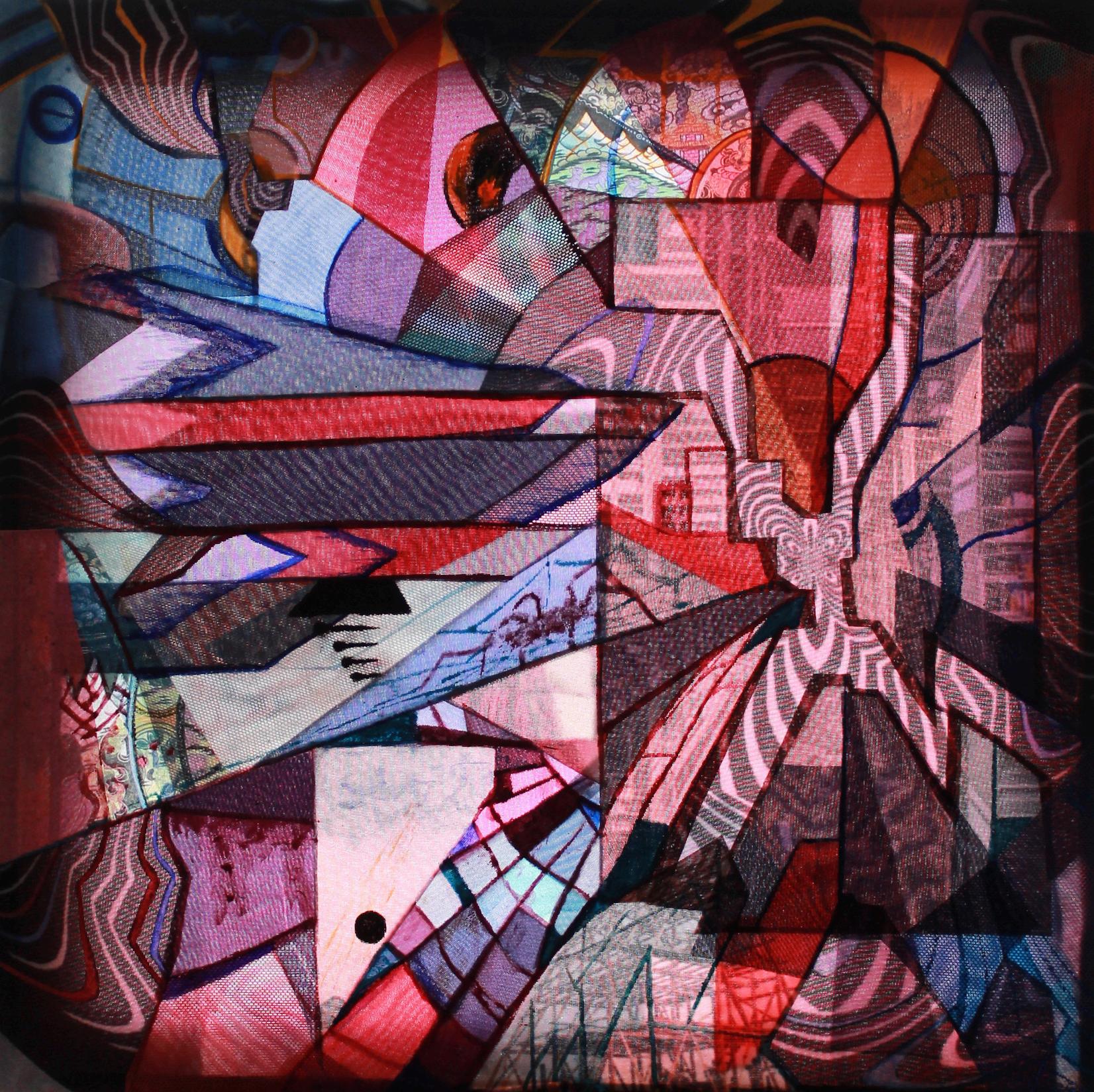 News, 2026, collage textil traslúcido con técnica mixta en caja de luz, 37 x 37 cm.
