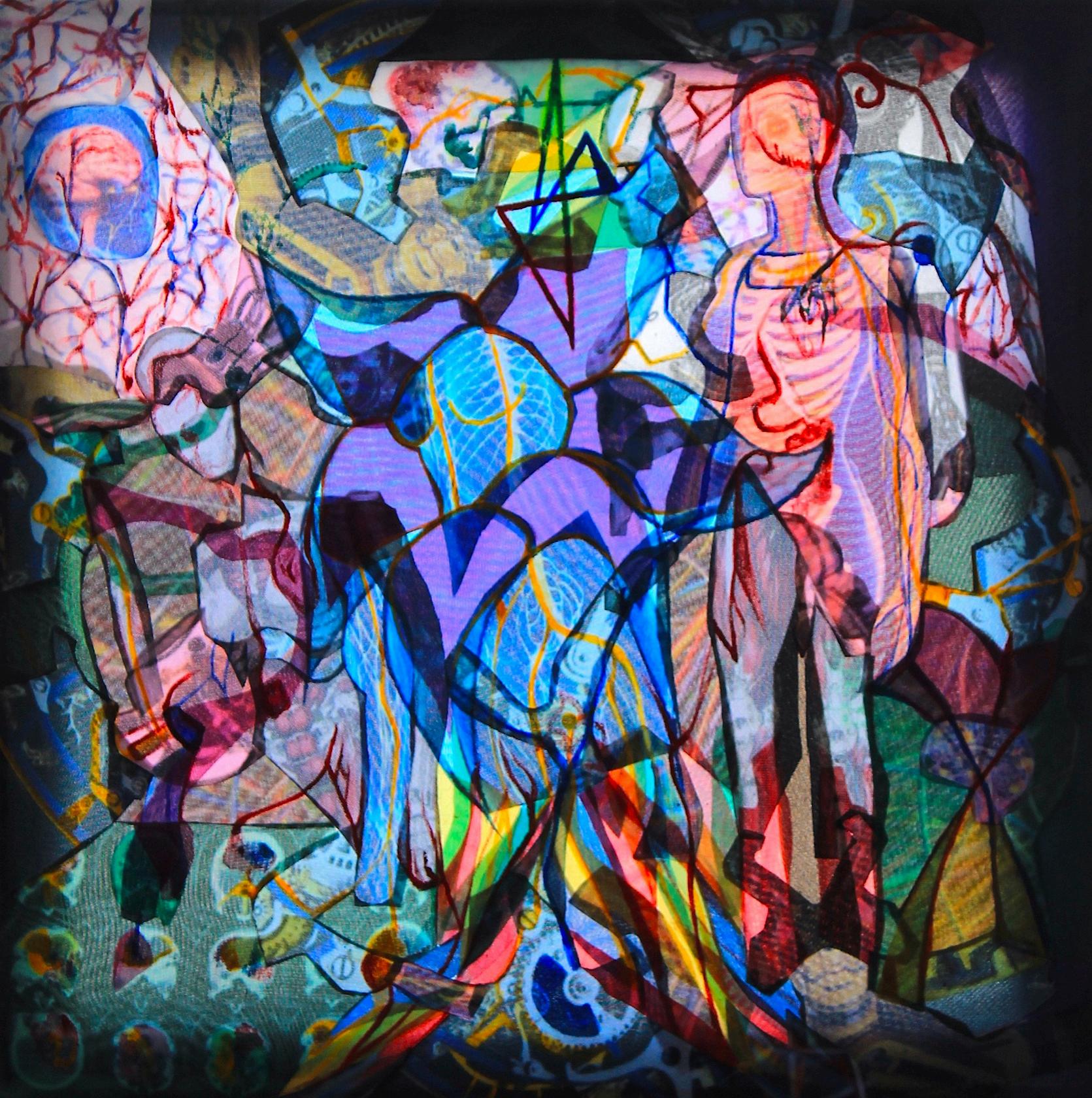 Cargando..., 2026, collage textil traslúcido con técnica mixta en caja de luz, 37 x 37 cm.